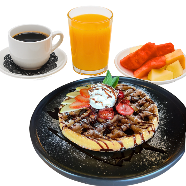 Disfruta de un desayuno completo, prueba nuestros esponjosos waffles dulces, acompañados de un café del día, un refrescante jugo de temporada y una porción de fruta picada, para iniciar tu día cargado de energía.