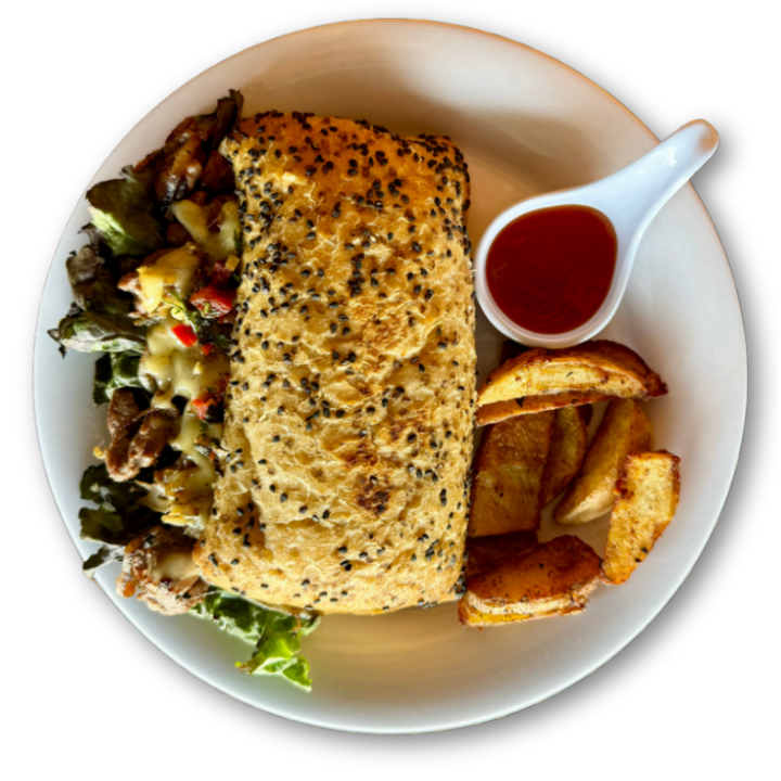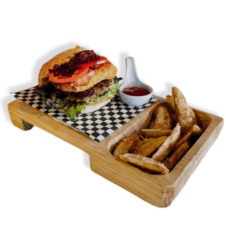 Pan bollo artesanal; relleno de carne elaborada con nuestra receta secreta, tocino a la BBQ, lechuga, jitomate, queso gouda empanizado y cebollas caramelizadas. Acompañada con deliciosas papas gajo de la casa y porción de cátsup.