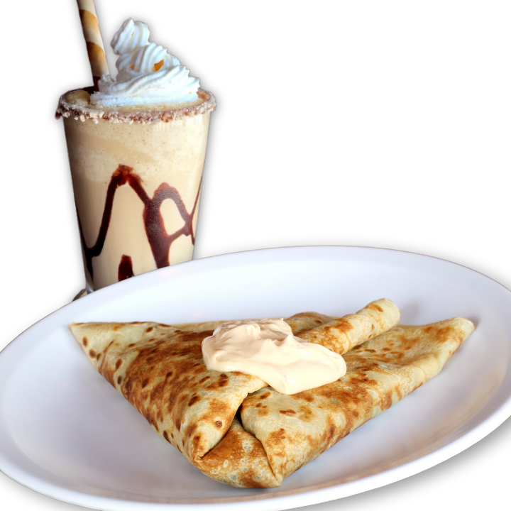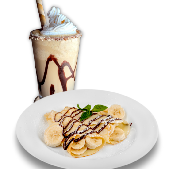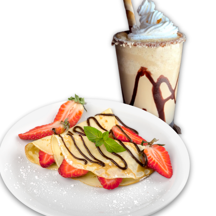 Disfruta de una crepa dulce rellena de 3 ingredientes a tu elección, acompañada de un delicioso frappé. ¡Perfecto para consentirte o compartir!