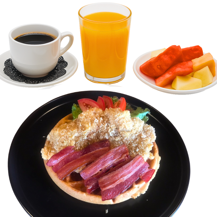 Disfruta de un desayuno completo; nuestros esponjosos waffles salados, acompañados de un café del día, un refrescante jugo de temporada y una porción de fruta picada, para iniciar tu día cargado de energía.