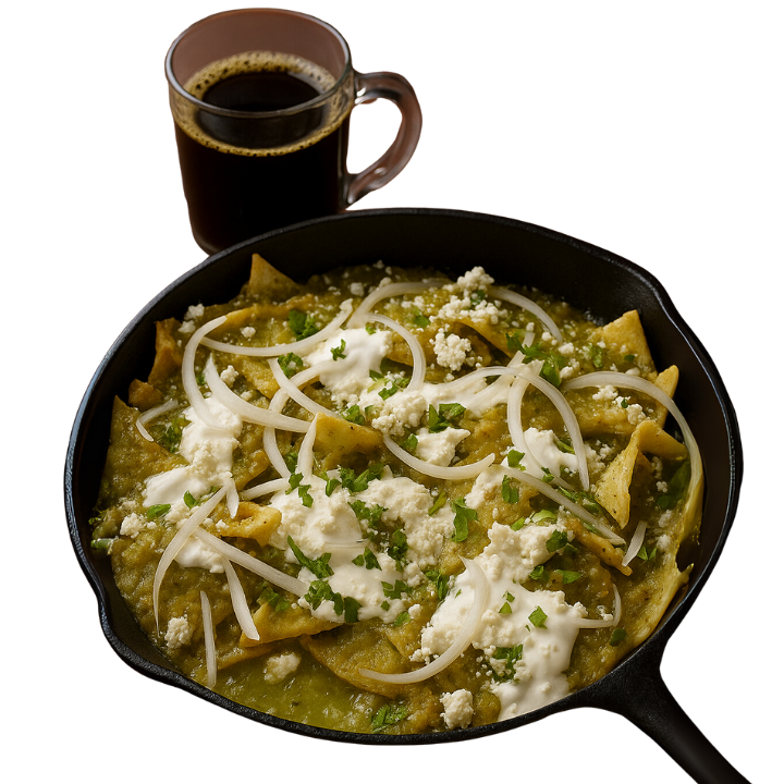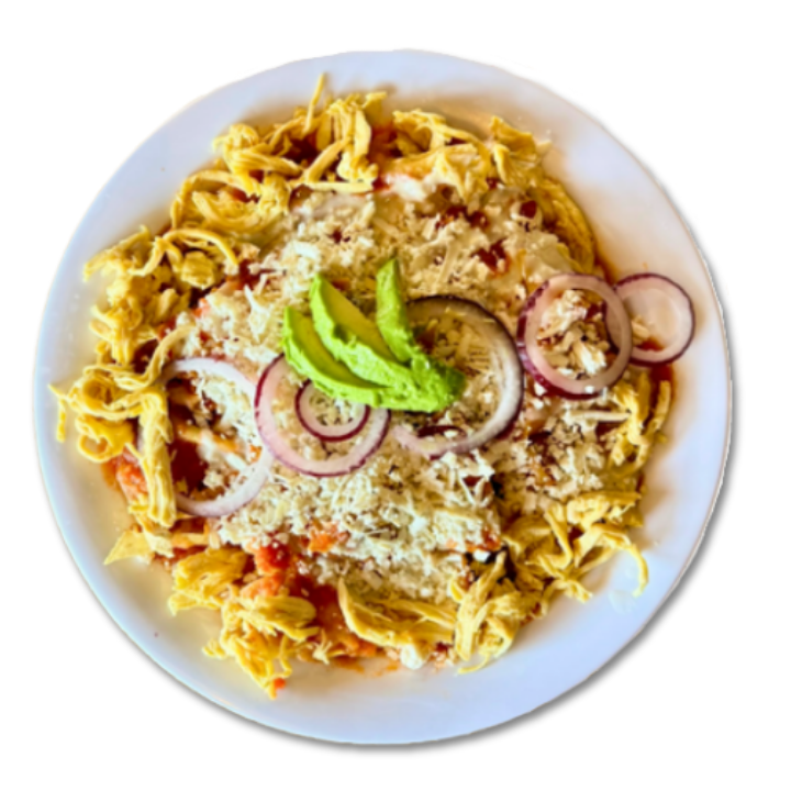 Totopos bañados con salsa roja o verde, acompañados de pollo deshebrado o huevo, queso ranchero, crema, aguacate y cebolla morada.