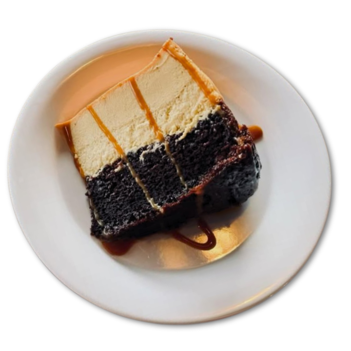 Rebanada de nuestro exquisito pastel 3 delicias, flan, cheesecake y pastel de chocolate; espolvoreado con azúcar glass.