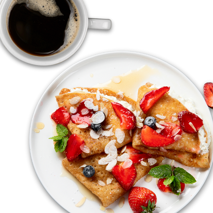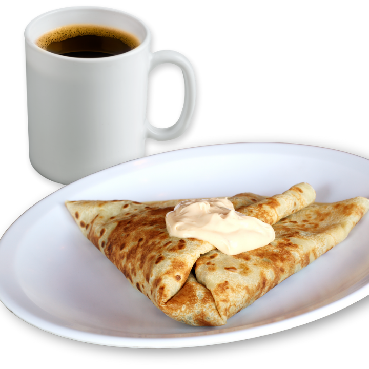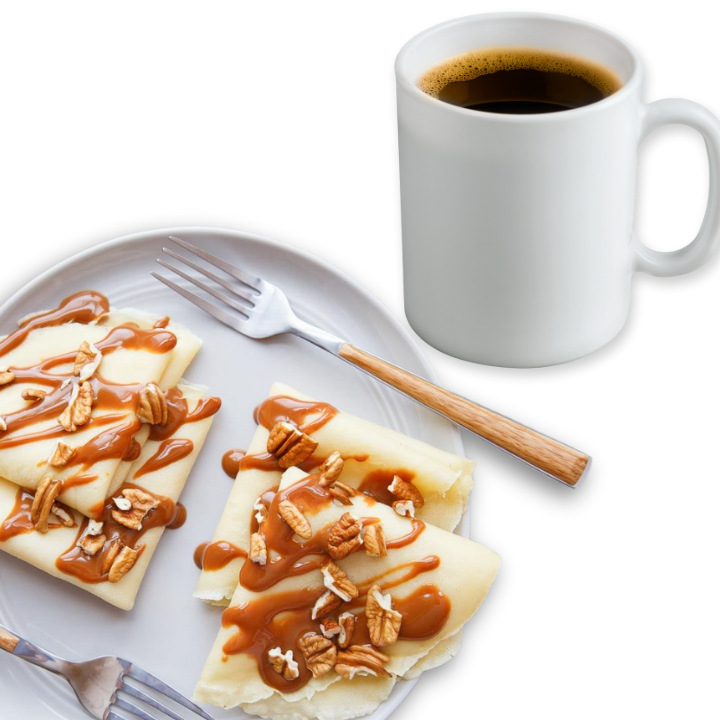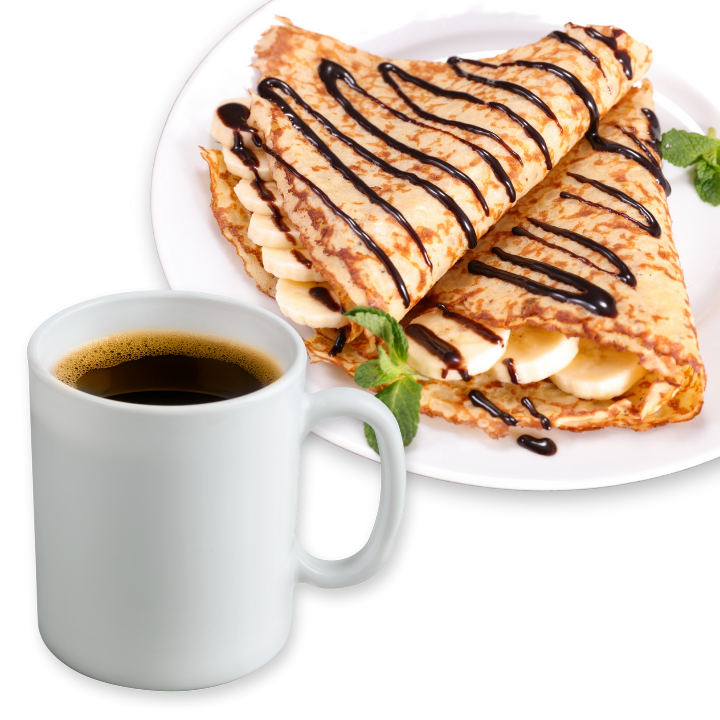 Disfruta de una deliciosa crepa dulce, escoge el ingrediente que desees y acompáñala con un café del día o una infusión frutal.