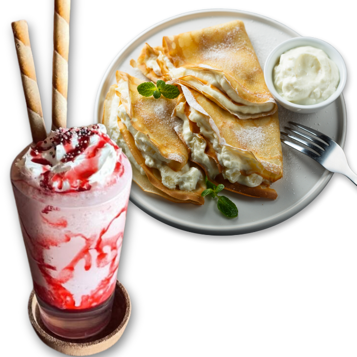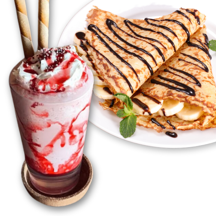 Disfruta de una crepa dulce rellena de 2 ingredientes a tu elección, acompañada de un delicioso frappé. ¡Perfecto para consentirte o compartir!