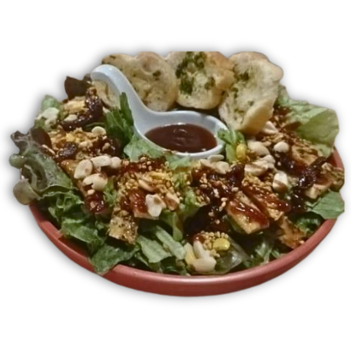 Pechuga de pollo asada con salsa BBQ, cebolla morada, elote en grano, ajonjolí y cacahuate tostado; acompañado con aderezo BBQ.
