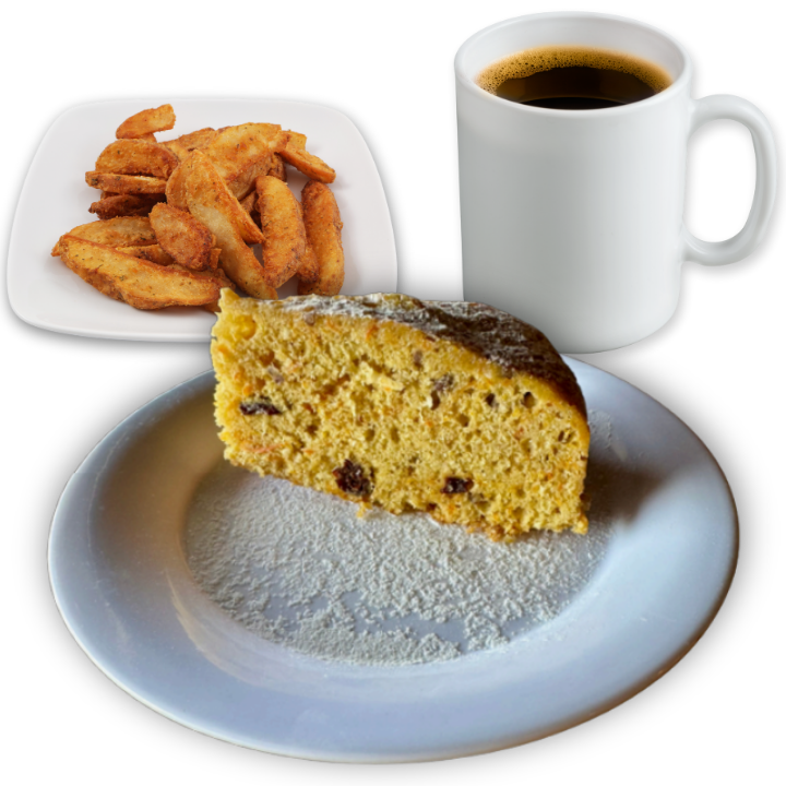 Disfruta el balance perfecto entre dulce y salado con nuestros combos de postres. Incluye un café del día, nuestro irresistible Panqué de Zanahoria, y una porción de crujientes papas gajo. Ideal para consentirte en cualquier momento del día.