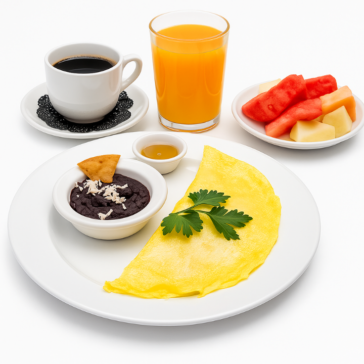 Disfruta de un desayuno completo, degusta un nutritivo omelette con queso, acompañado de un café del día, un refrescante jugo de temporada y una porción de fruta picada, para iniciar tu día cargado de energía.