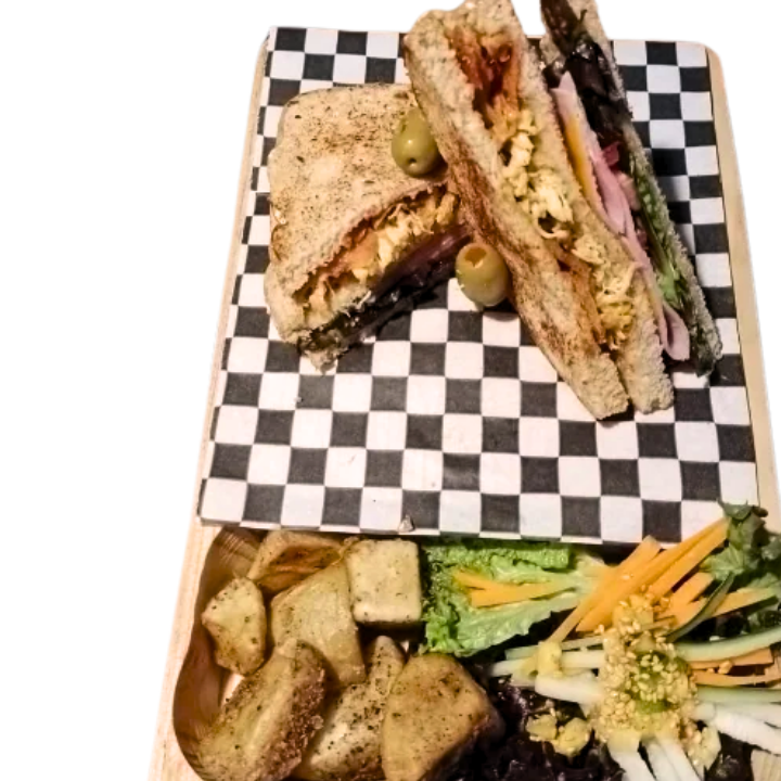 3 piezas de pan de caja estilo "masa madre"; relleno de pechuga de pollo asada a las finas hierbas, tocino supreme, cebollitas caramelizadas, queso gouda, queso mozzarella, mostaza, mayonesa, lechuga y jitomate frescos.