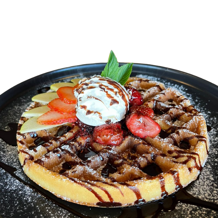 Deliciosos waffle acompañado de compota de frutos rojos, rebanadas de manzana y fresa, crema batida y jarabe de chocolate. Adornado con azúcar glass y hojas de hierbabuena.