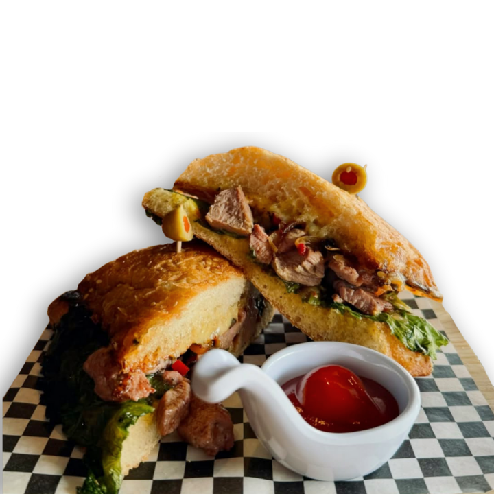 Arrachera marinada asada, cebollitas caramelizadas, lechuga fresca, queso gouda y un toque de salsa chimichurri.