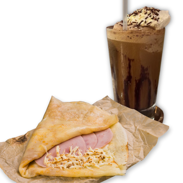 Disfruta una crepa salada recién preparada, elige tu relleno favorito entre nuestras opciones y acompáñala con un delicioso frappé bien frío. ¡El combo perfecto para cualquier momento del día!