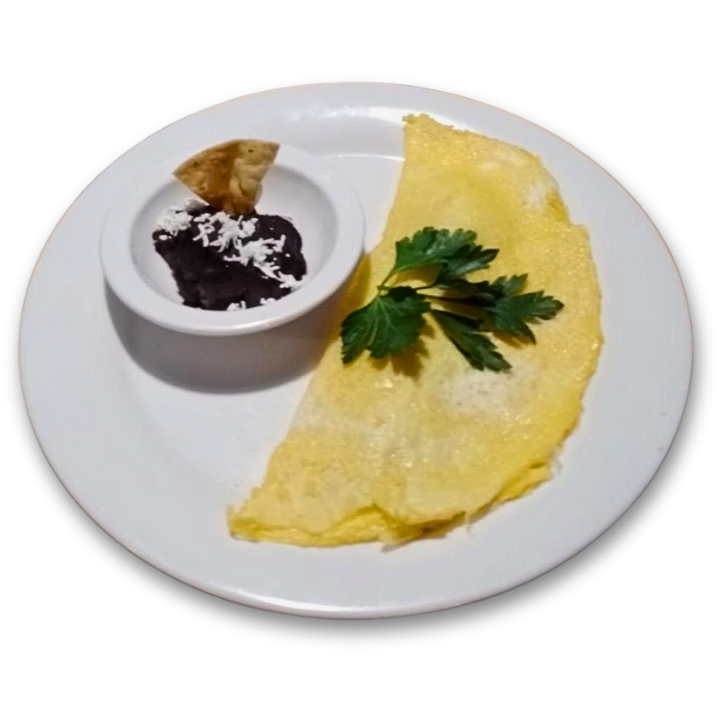 Tortilla de huevo rellena de queso gouda con jamón, tocino, champiñones o chorizo.