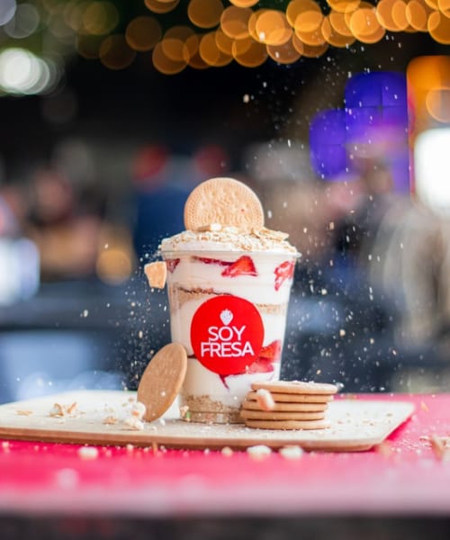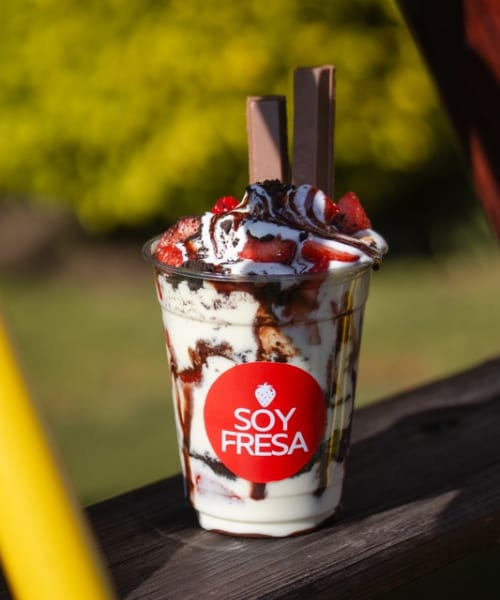 Fresas con crema Soy Fresa con una salsa dulce y dos topping de tu elección