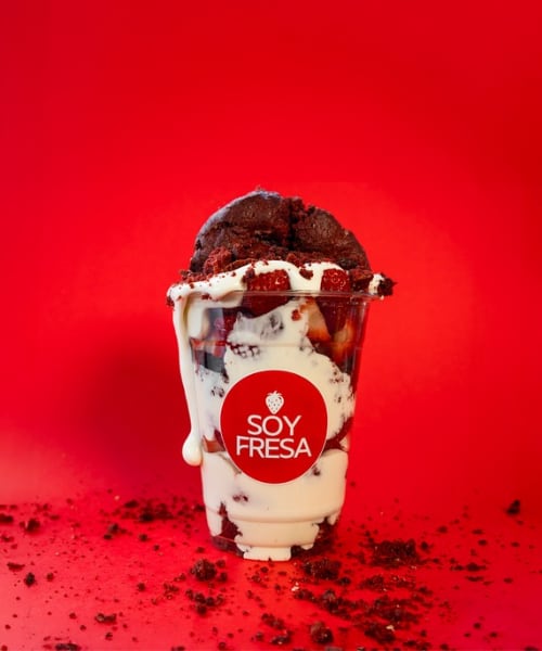 Fresas con crema de la casa, acompañado de capas de galleta y media galleta de Red Velvet de iCookie como topping