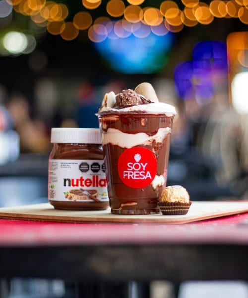Fresas con crema, vaso cubierto de Nutella, acompañado con Nutella B-ready y Ferrero