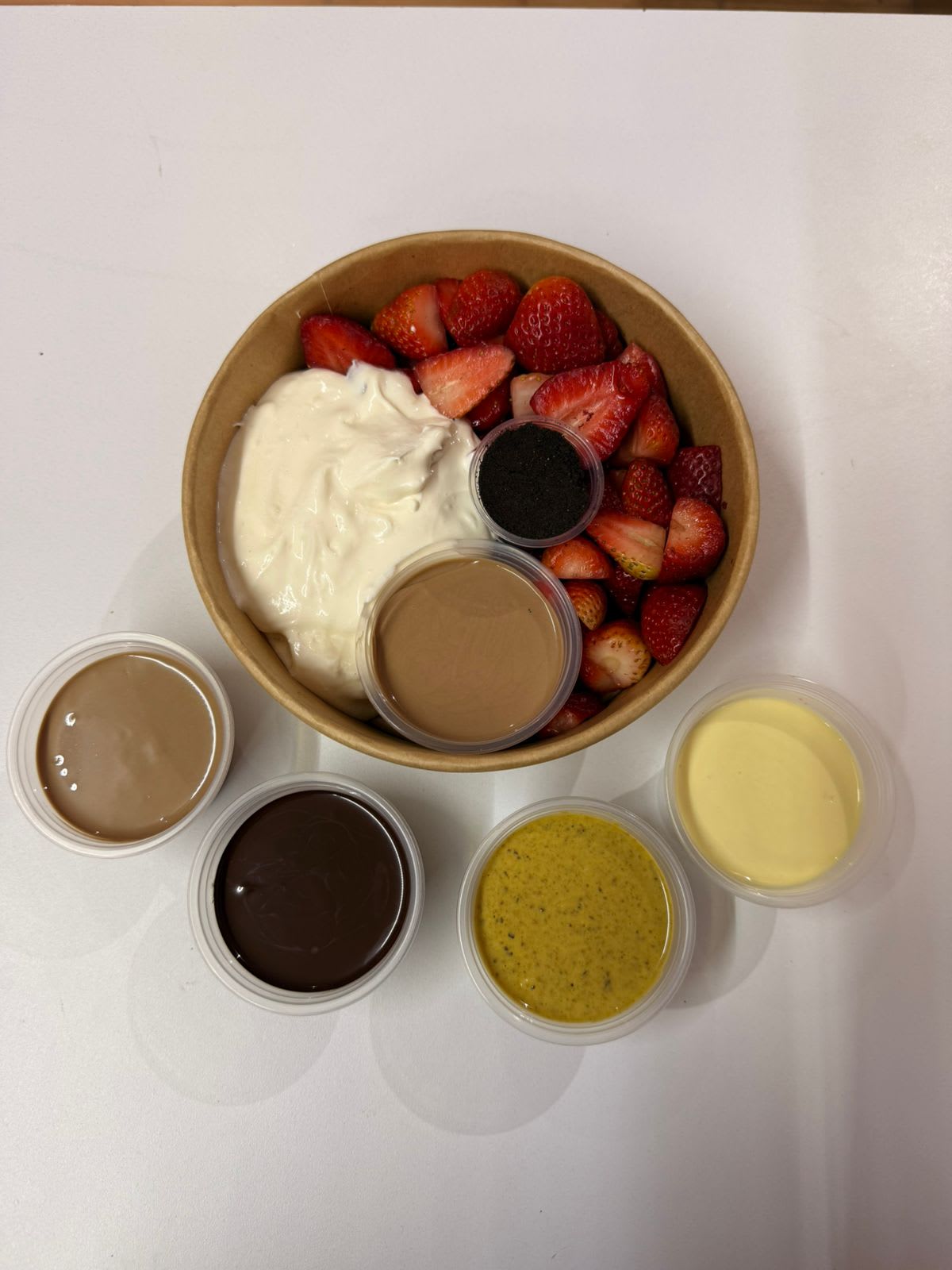 bowl con fresas con crema, 1 dip y 1 topping a elegir
