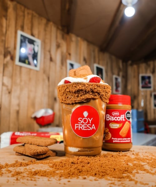 Fresas con crema, lotus untable, escarchado con galleta triturada y 2 galletas lotus