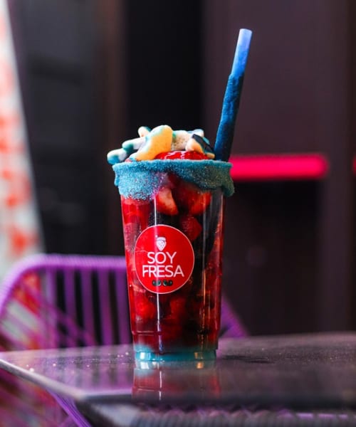 Fresas, chamoy, limón, tajín, 2 gomitas a elegir, escarchado con gel y miguelito de sabores, acompañado de un tarugo