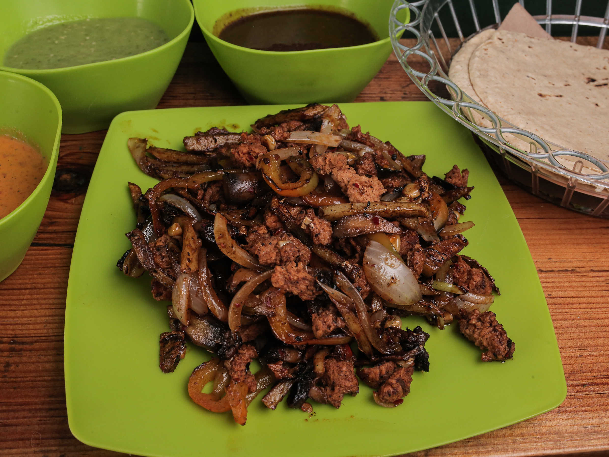 Soya marinada tipo pastor,Incluye cilantro, cebolla, piña, 15 piezas de pan árabe o tortillas de maíz, 1 salsa, 1 complemento y limones.