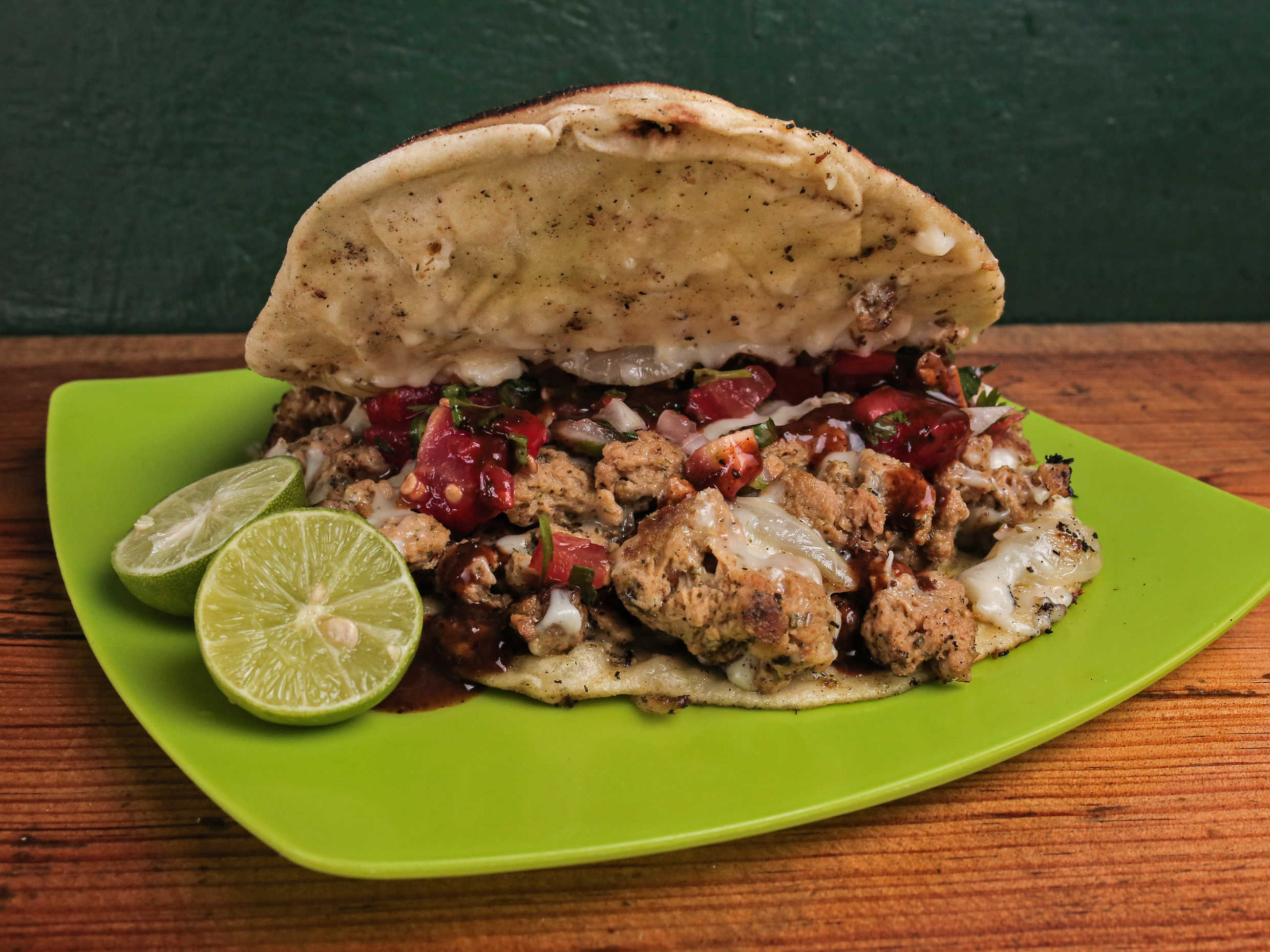 Soya marinada tipo pastor, doble tortilla de harina, y doble porción de queso.