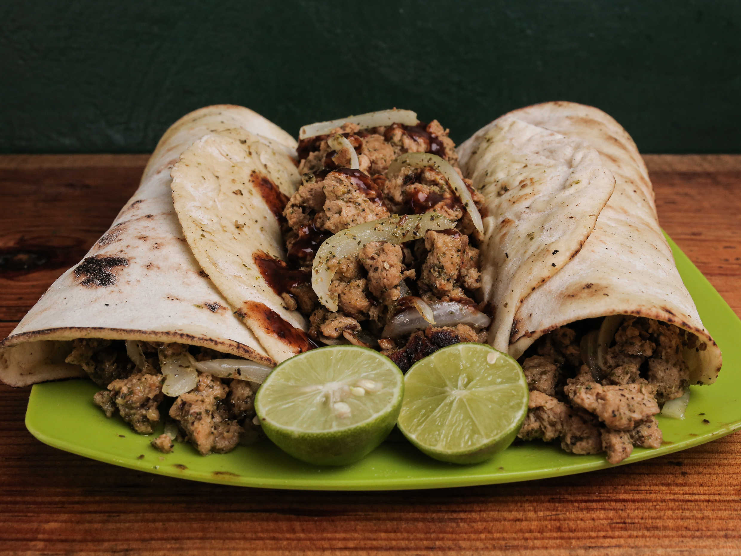 Tortilla de maíz o pan árabe con soya mezclada tipo árabe y pastor, acompañada de cilantro, cebolla y piña.