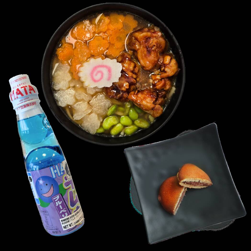 Versión para peques de nuestro matsuri ramen con verduras: zanahoria, jícama y edamames. Incluye un taiyaki y una botella de ramune. ¡Perfecto para los peques! contiene cacahuate y ajonjolí.
