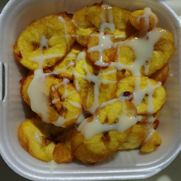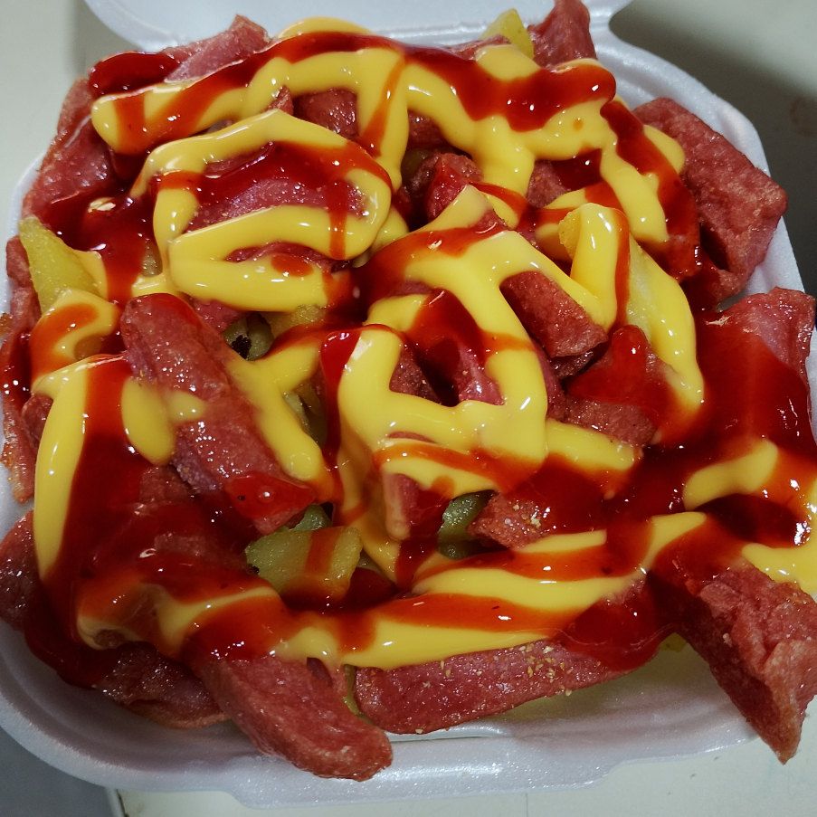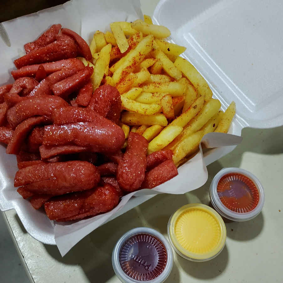 Papas a la francesa, salchichas, mayonesa, queso y catsup