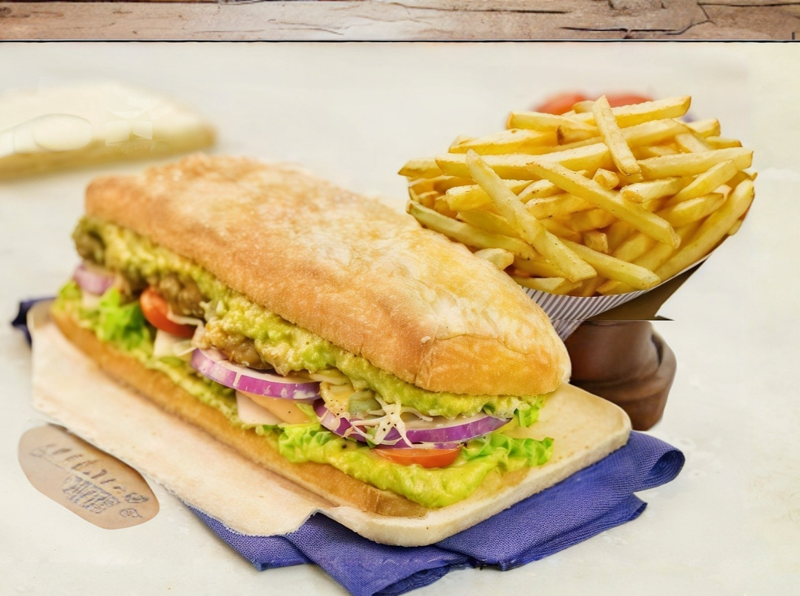 Pan chapata con pollo asado y papas a la francesa