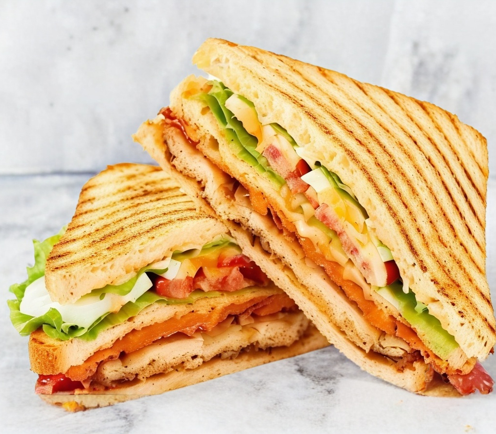 Sandwich de pollo asado con tres capas de pan,aguacate y chile