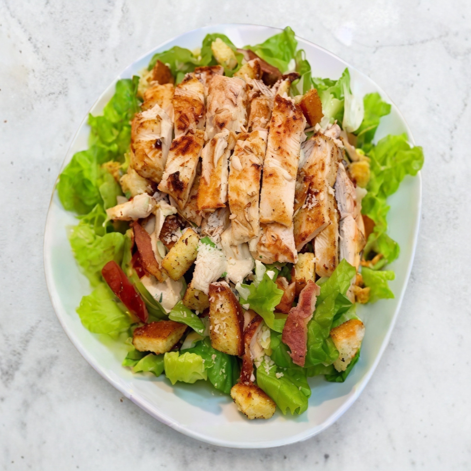 Base de Lechuga, Aguacate, Pepino, Jitomate, Cebolla y Milanesa de Pollo.