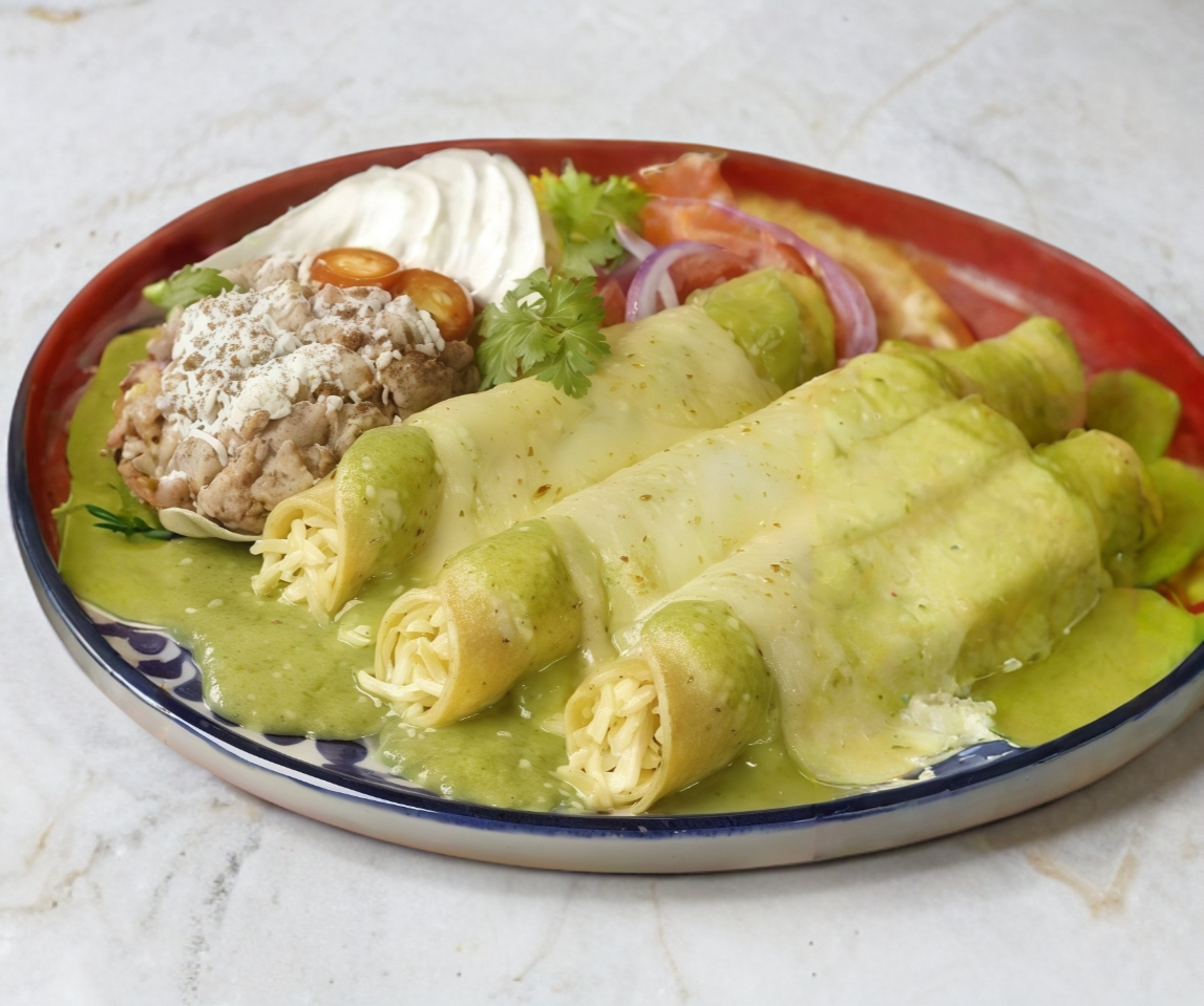 3 Piezas de Enchiladas con Salsa Verde, Queso Gratinado, Crema y Cebolla.
