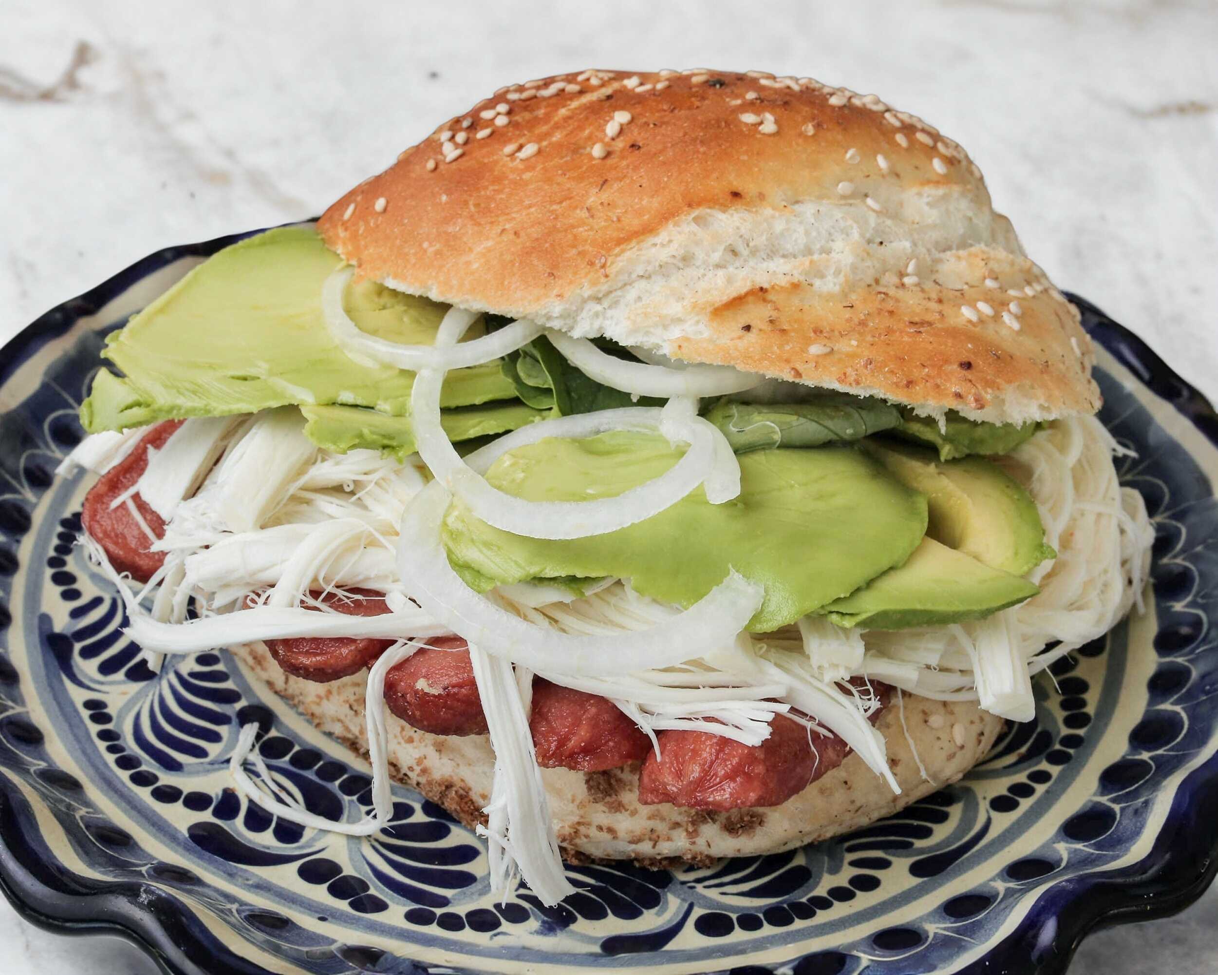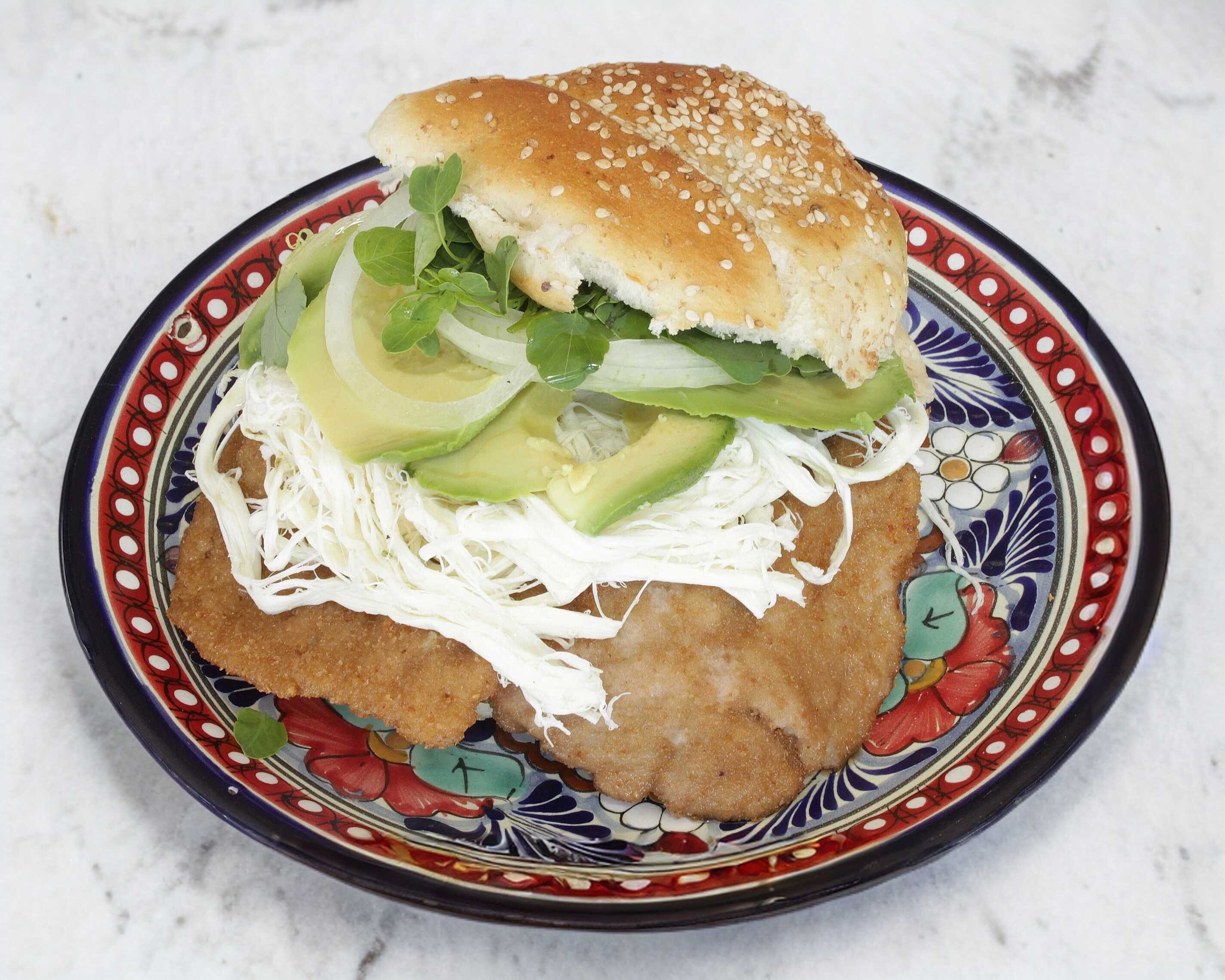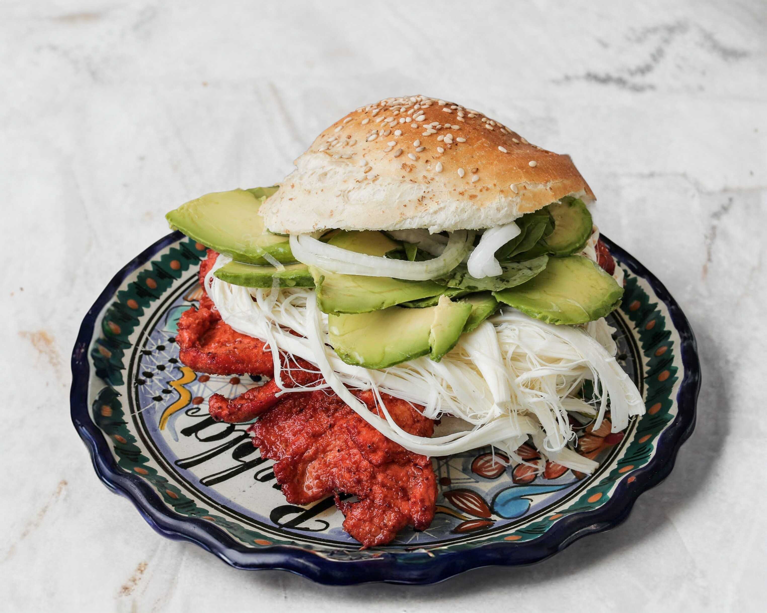 Pan de cemita, 120 de carne enchilada, aguacate, quesillo, cebolla, rajas ó chipotle.