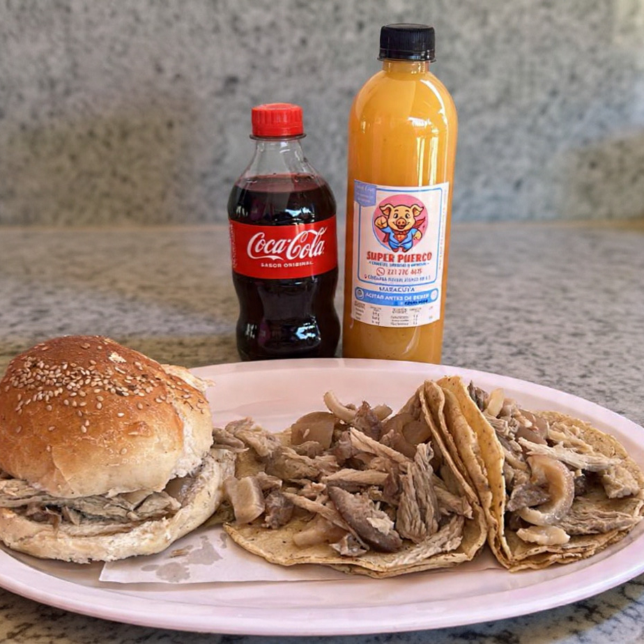 2 tacos de surtido,1 cemita de surtido y 1 refresco de 355 ml o agua de sabor a elegir.