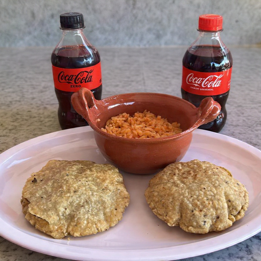 2 gorditas de chicharron,1 complemento a elegir y 2 refrescos de 355ml o dos aguas de sabores.