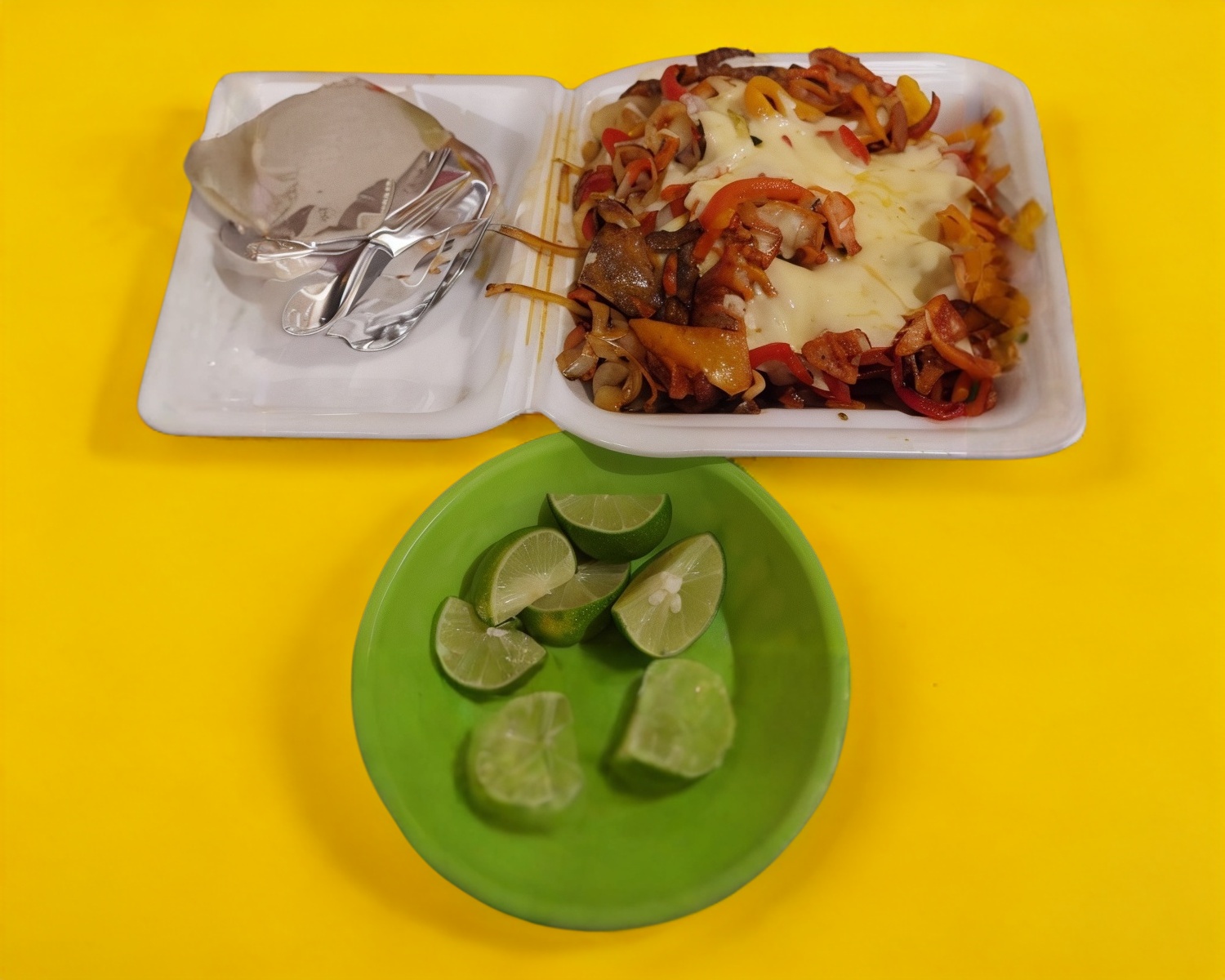 Queso fundido, carne, 4 tortillas harina, verdura, salsas y limones