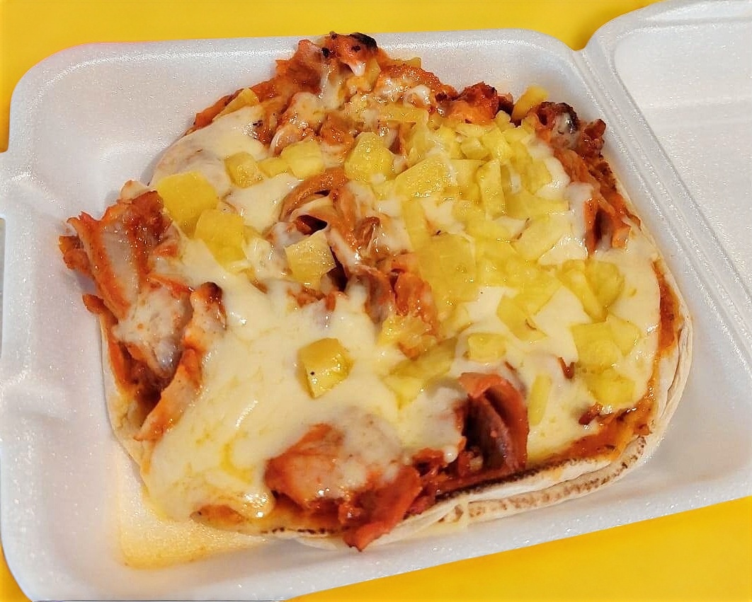 Tortilla maíz, carne, verdura, piña y salsas.