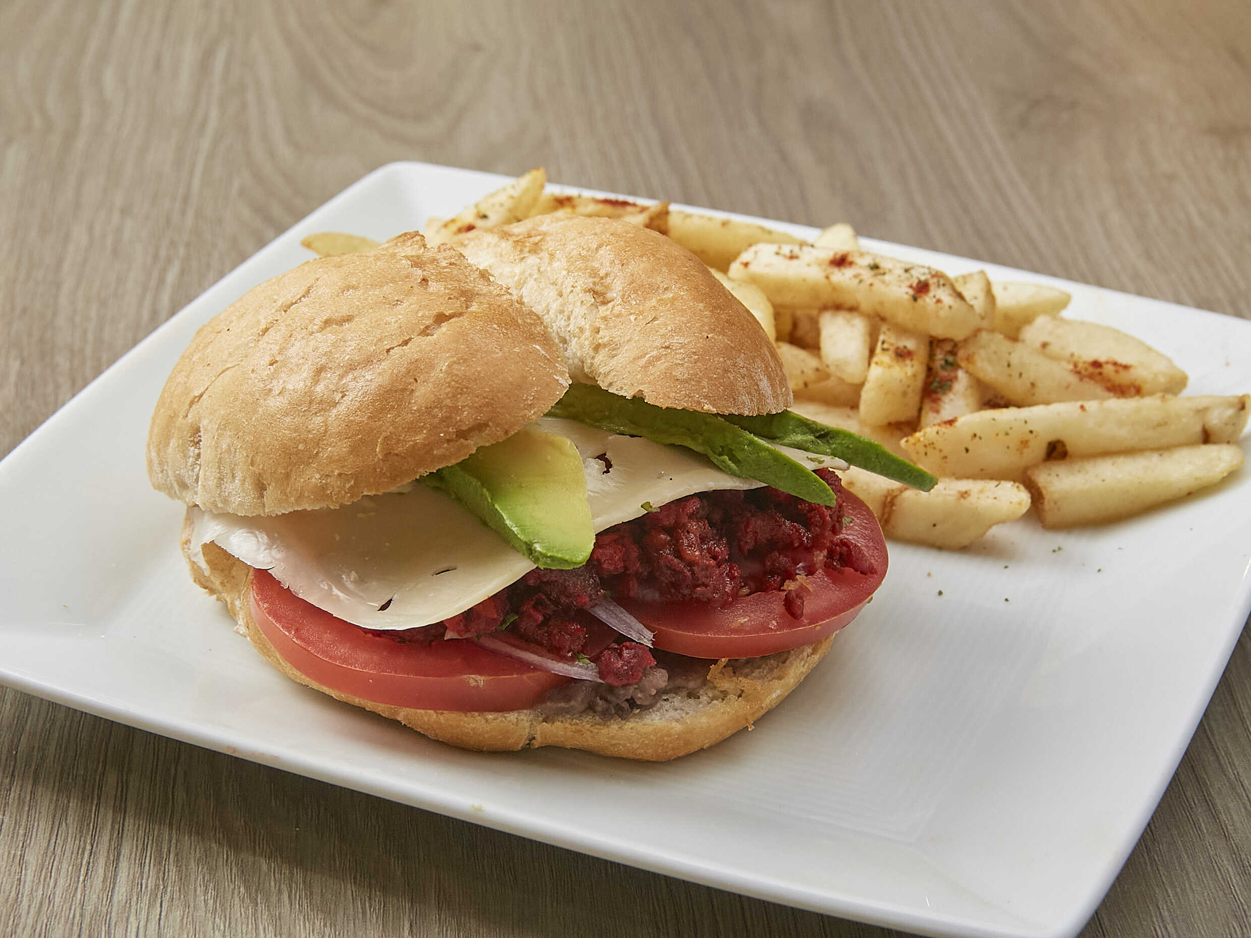 Torta de milanesa de res, salchicha, jamón, queso oaxaca, con mayonesa, frijoles, mantequilla, jitomate, cebolla blanca y aguacate.