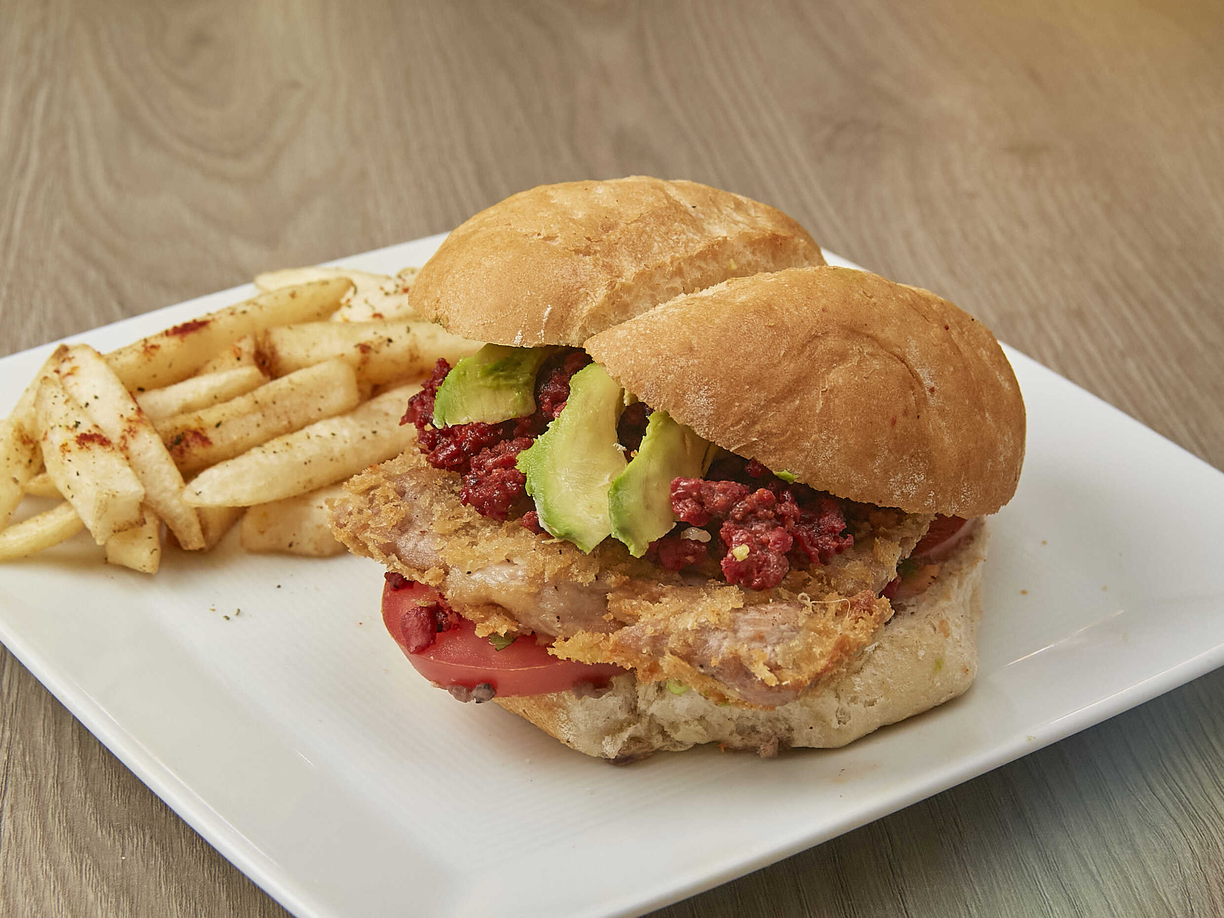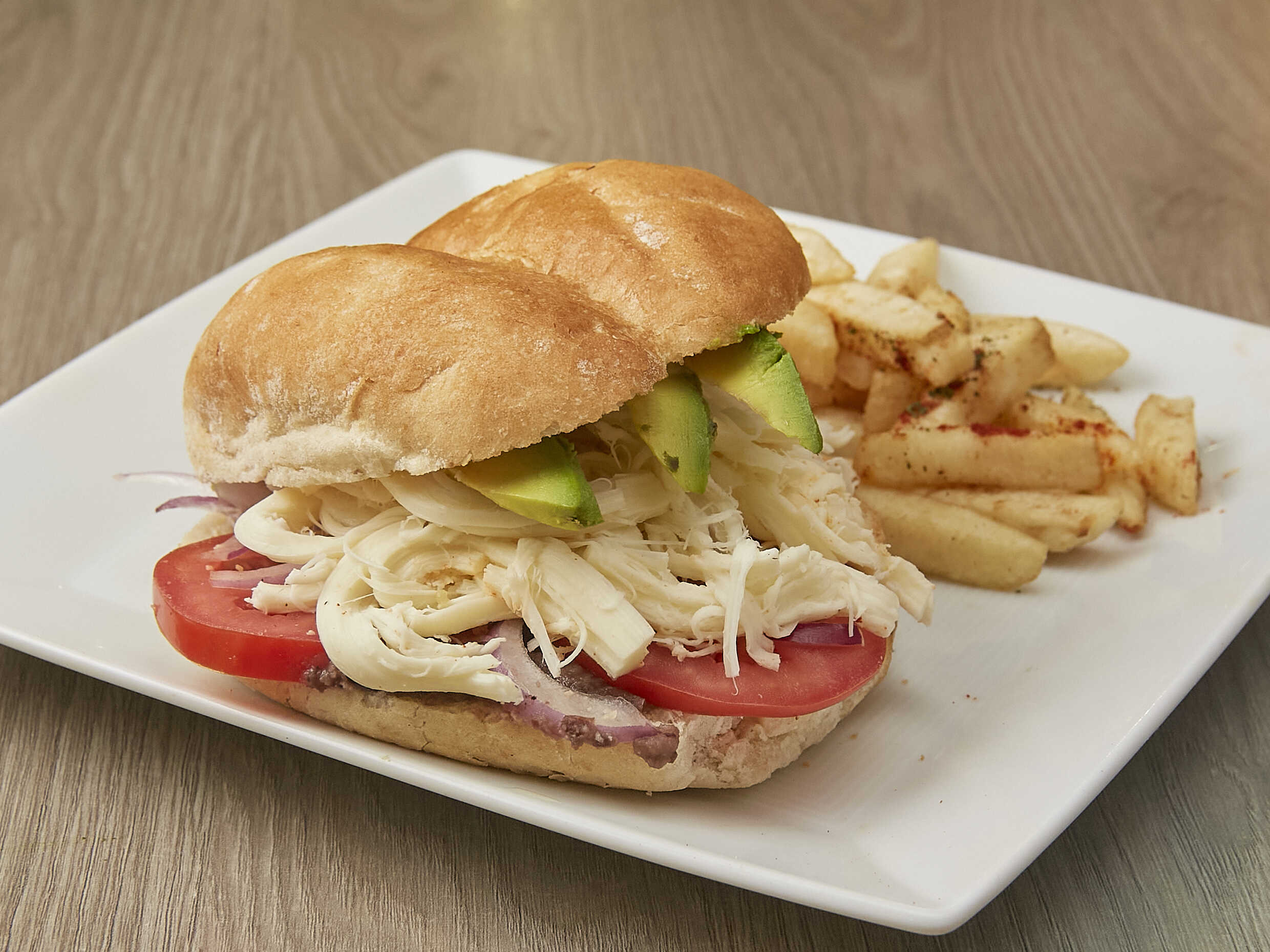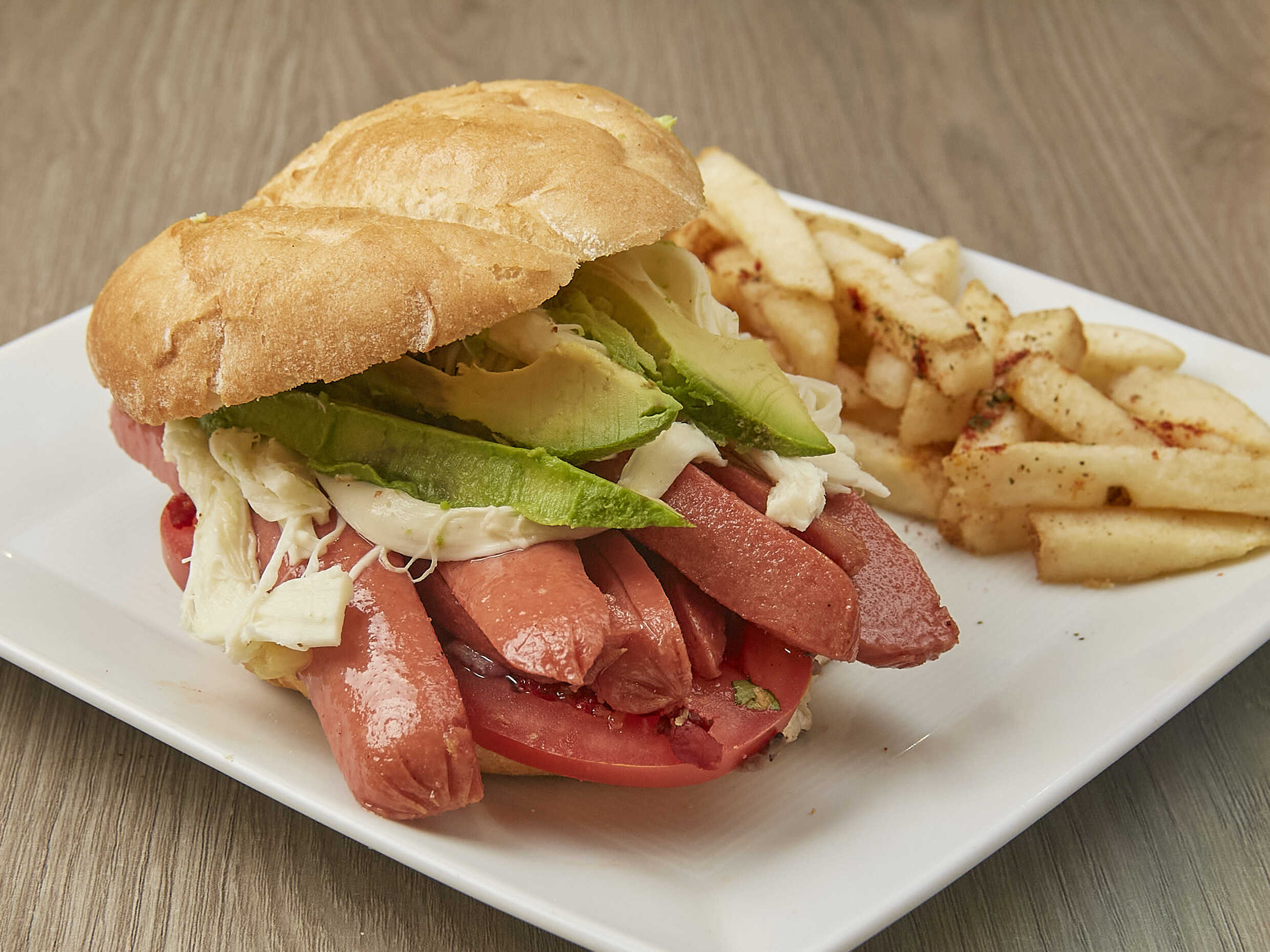 Torta de milanesa de cerdo, carne enchilada, salchicha jumbo, jamón de pierna, queso amarillo, quesillo, con mayonesa, frijoles, cebolla blanca y aguacate.