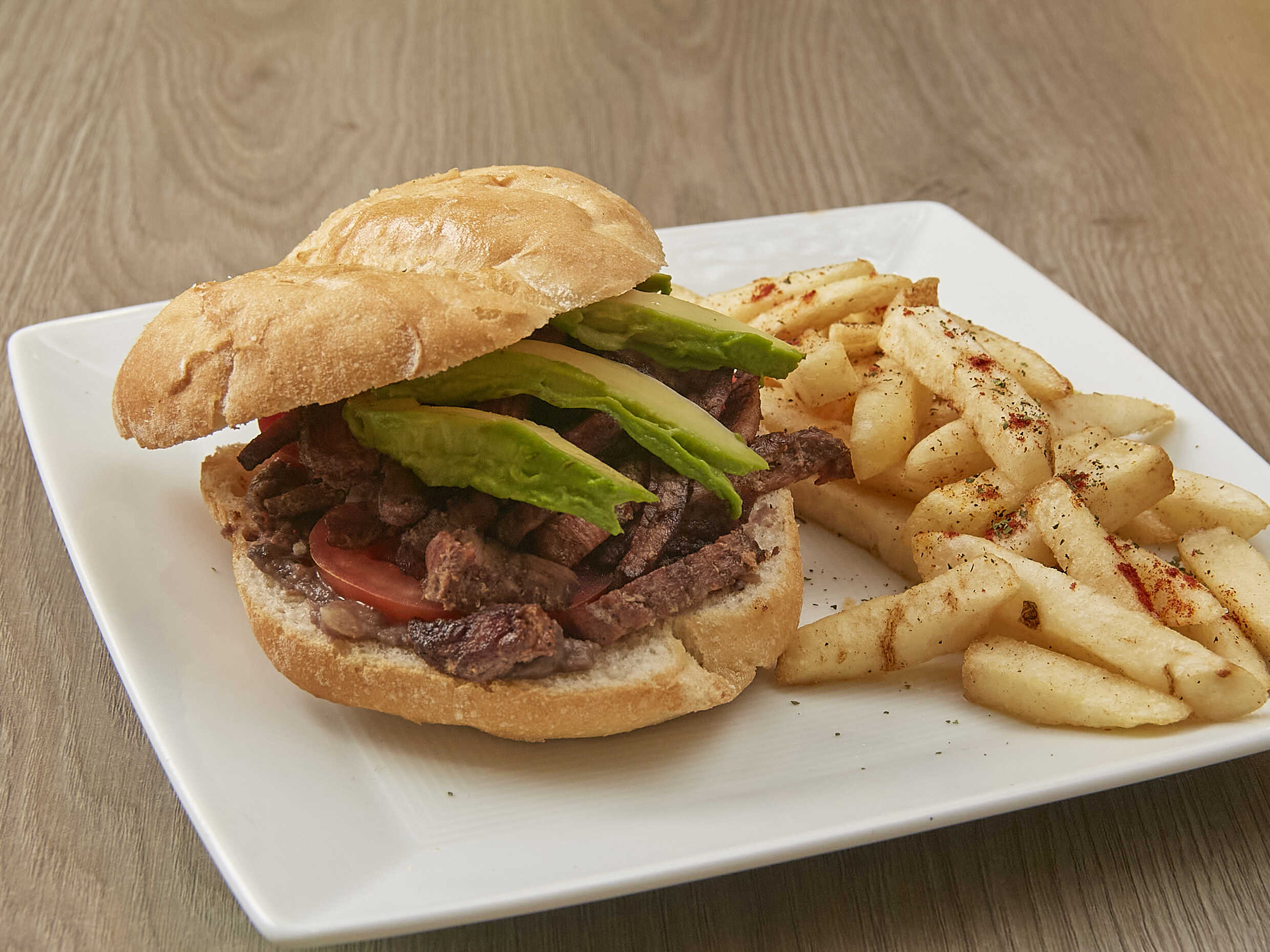 Torta de arrachera, con queso oaxaca, guacamole, mayonesa, frijoles y jalapeños.