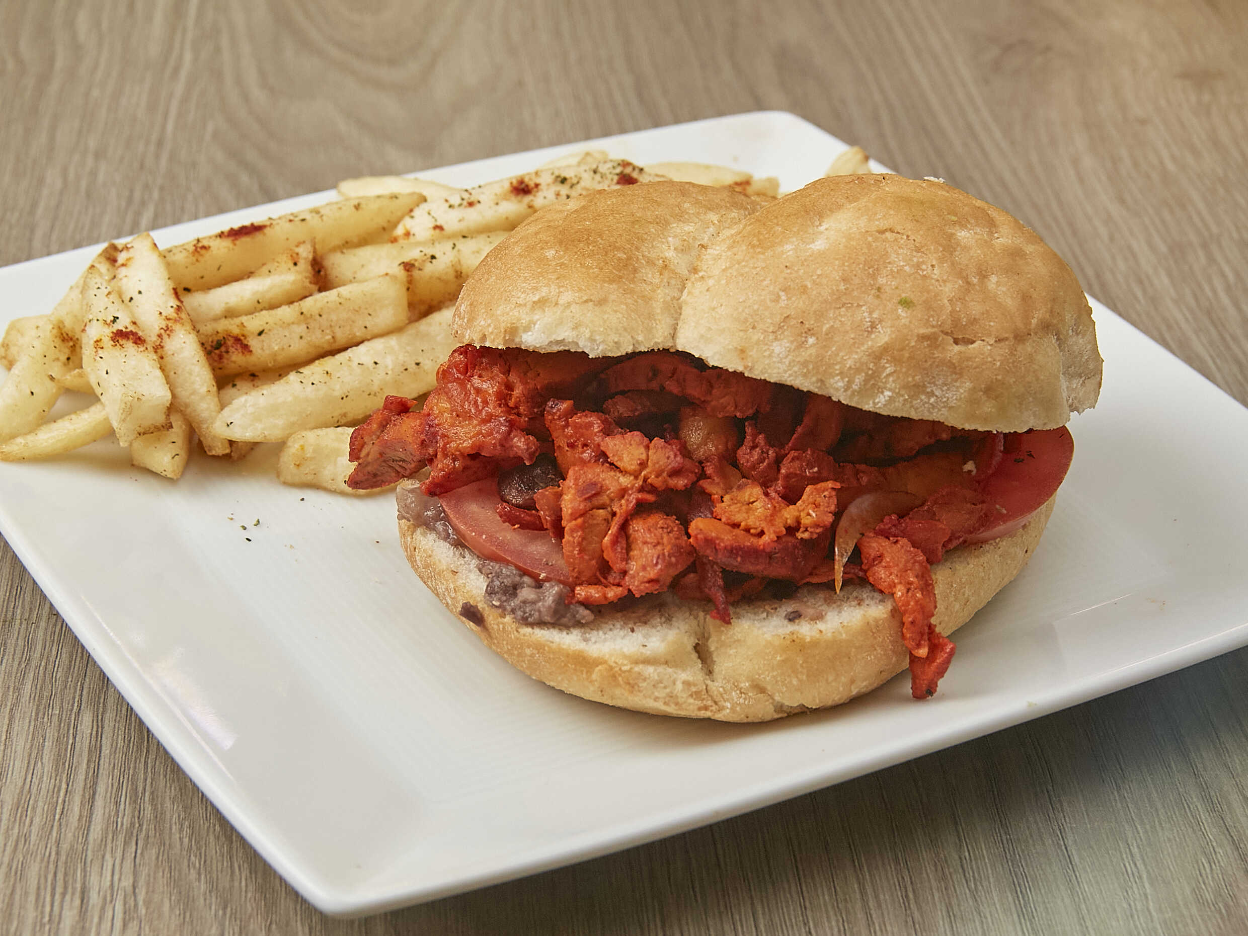 Torta de carne enchilada de cerdo, con mayonesa, frijoles y jitomate.