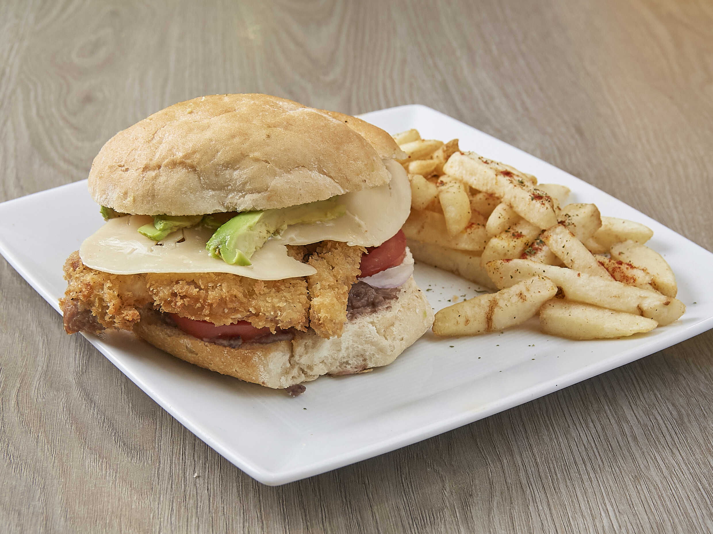 Torta de milanesa de pollo, con mayonesa, frijoles, mantequilla, jitomate, cebolla blanca y aguacate.