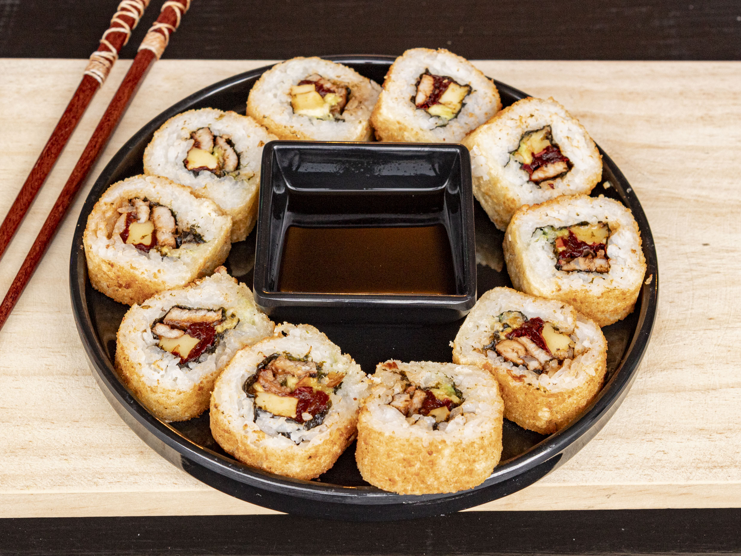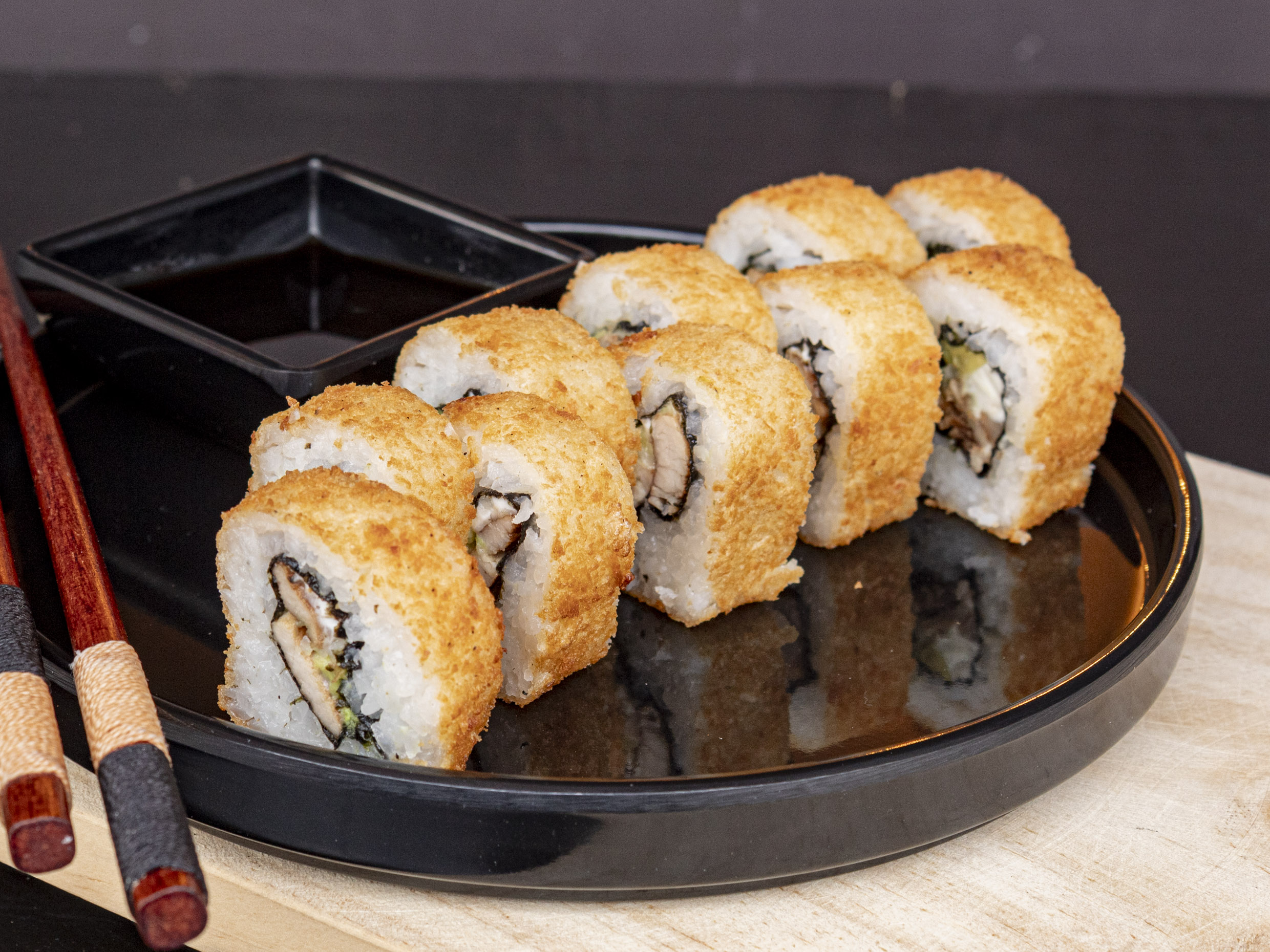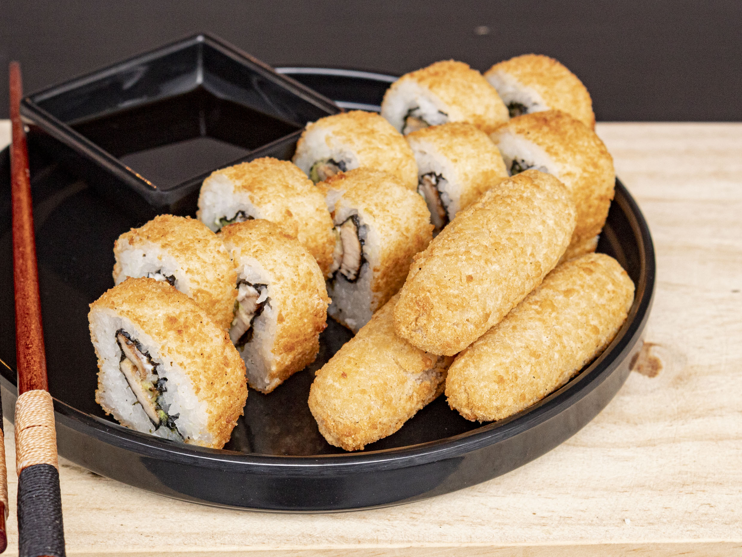 Bola de arroz rellena de philadelphia, aguacate, tampico y camarón empanizado.