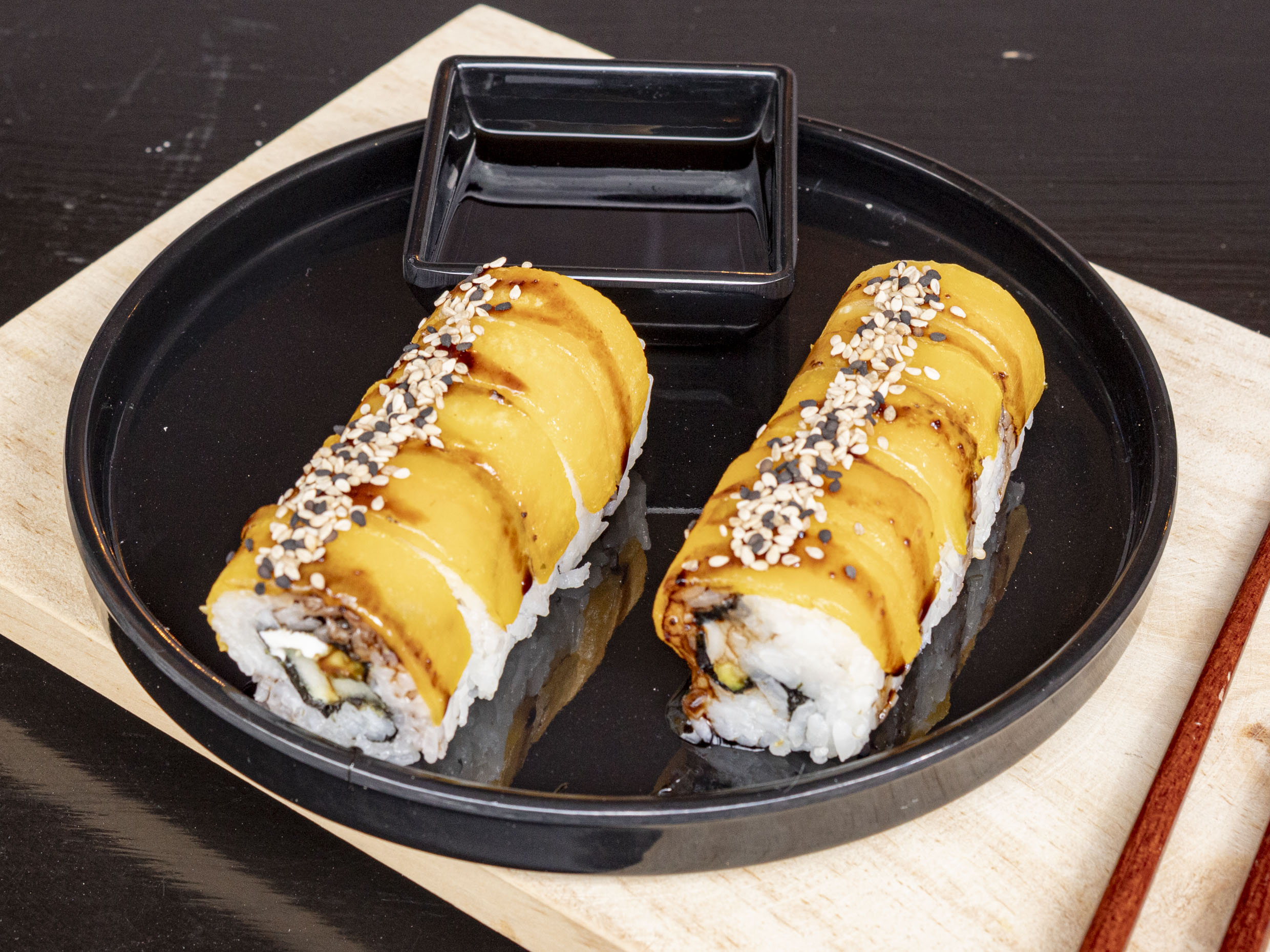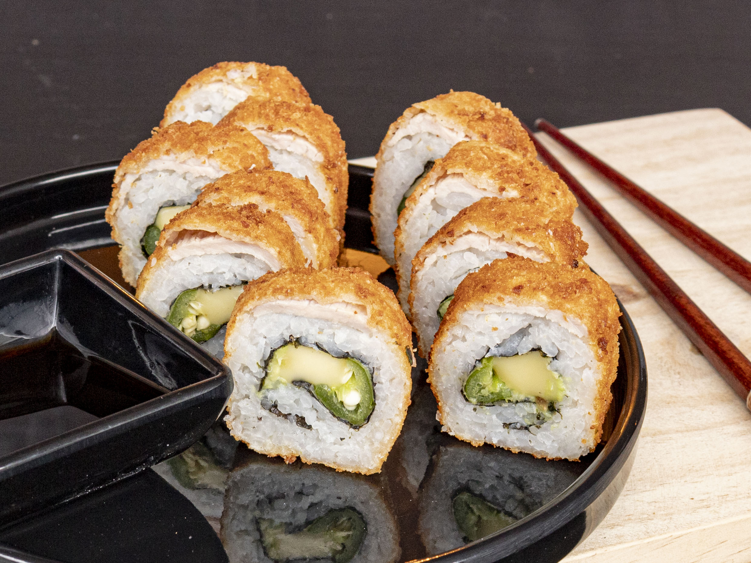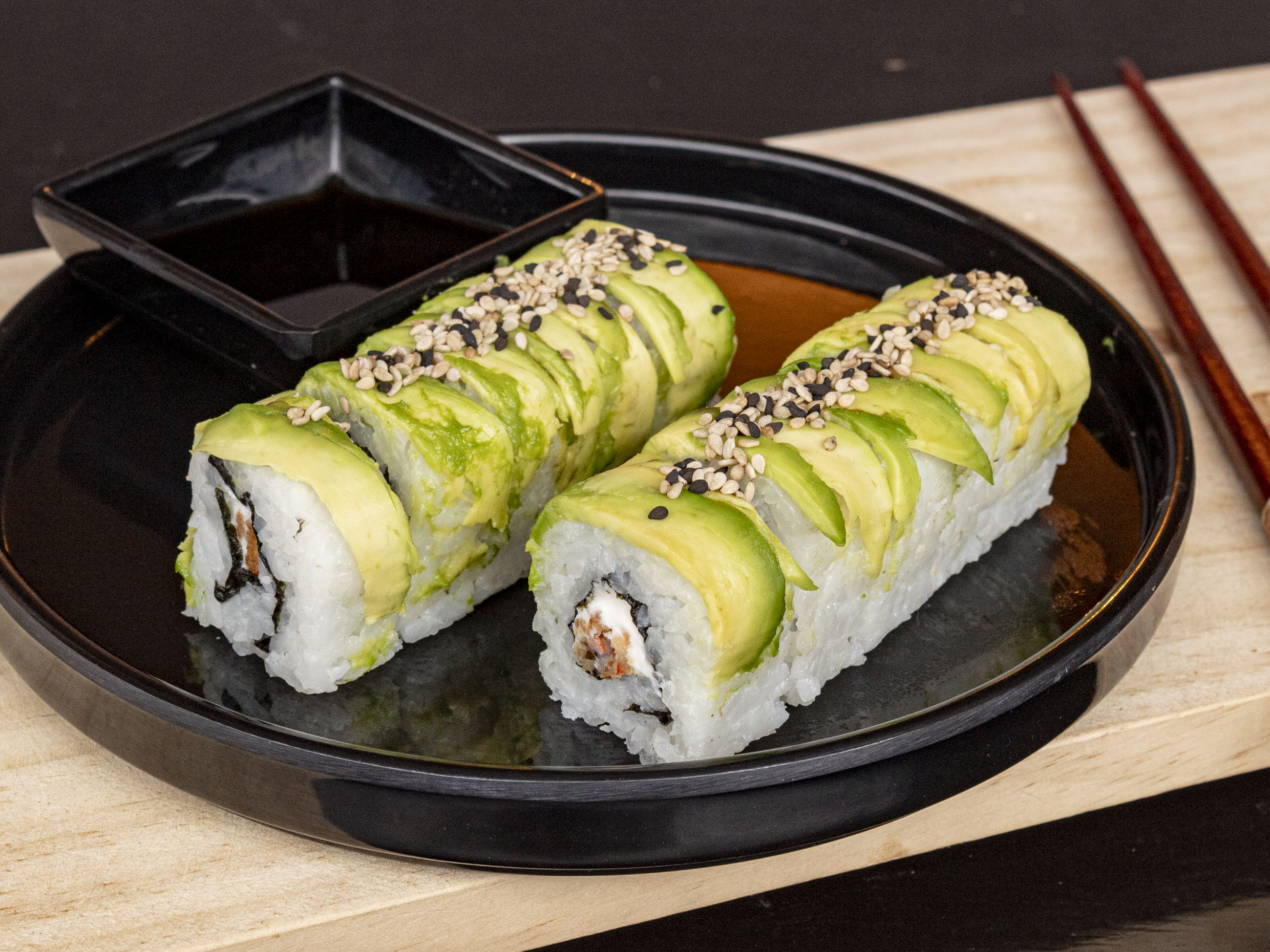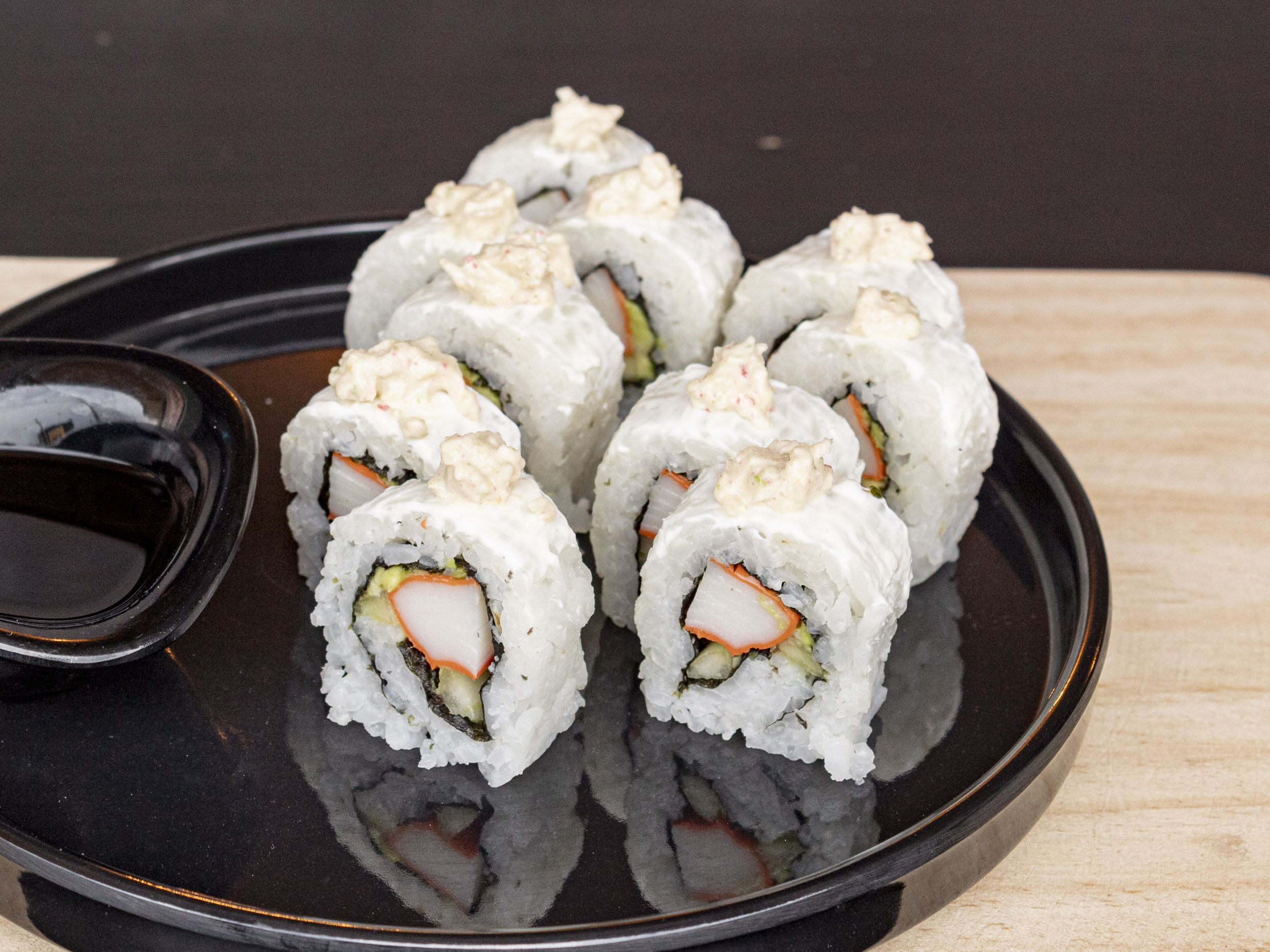 Cangrejo, pepino, aguacate, queso, masago y tampico por fuera.
