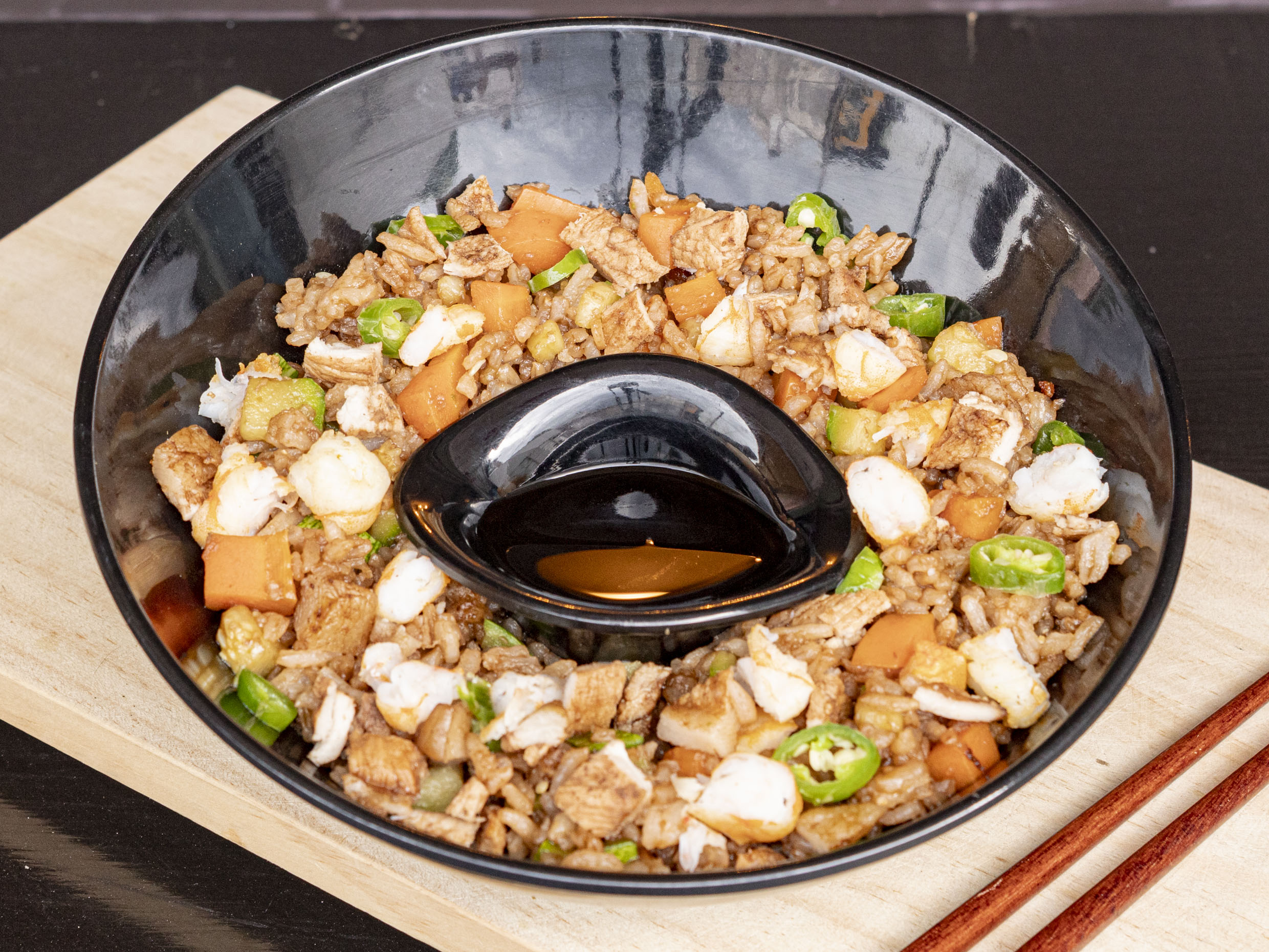 Arroz frito acompañado de verduras, con proteína a su elección (pollo, camarón, arrachera).