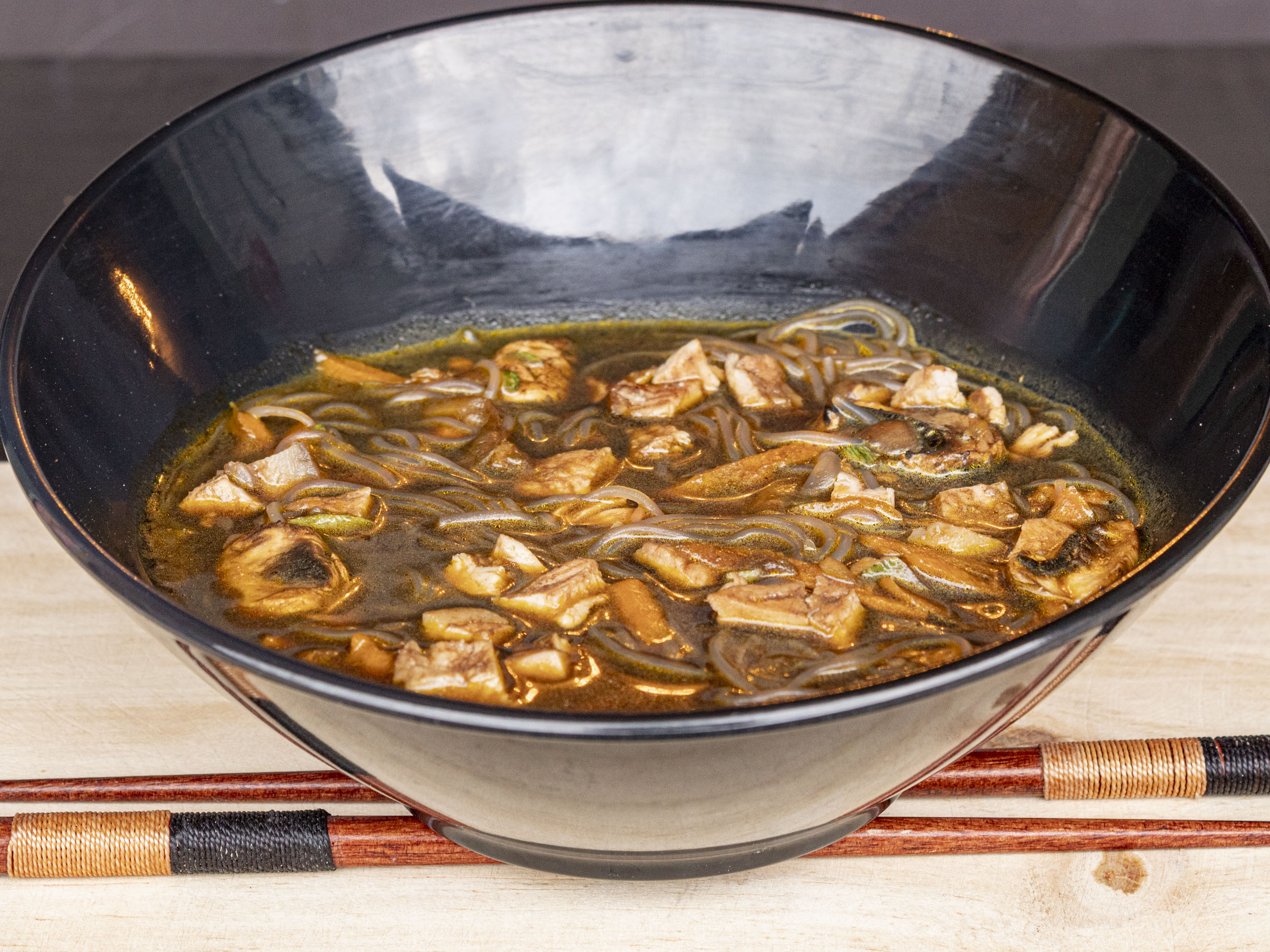 Pasta acompañada de champiñones, zanahoria, cebollín y pollo con dashi.