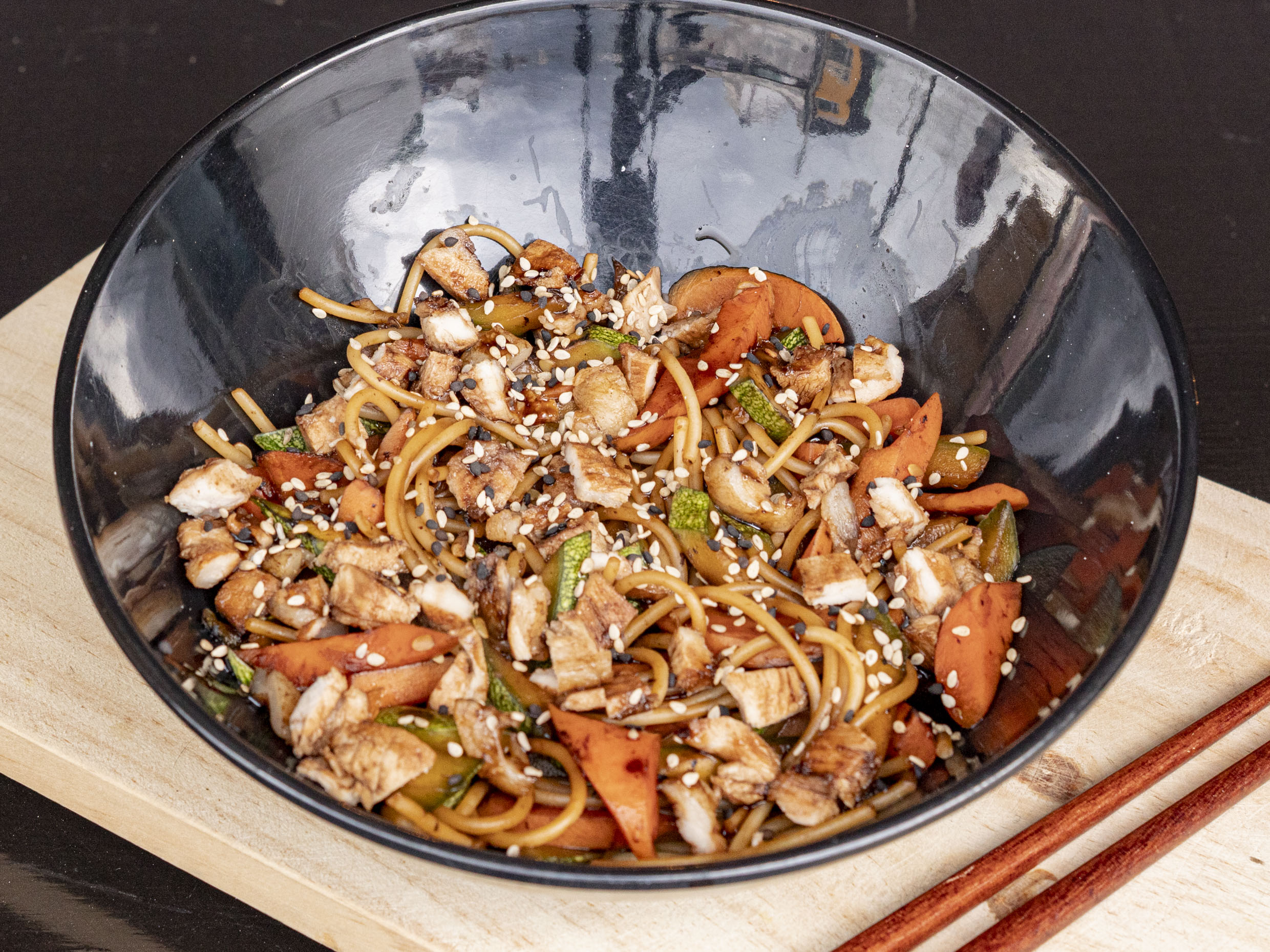 Tallarines a la plancha con verduras y pollo en salsa teriyaki.
