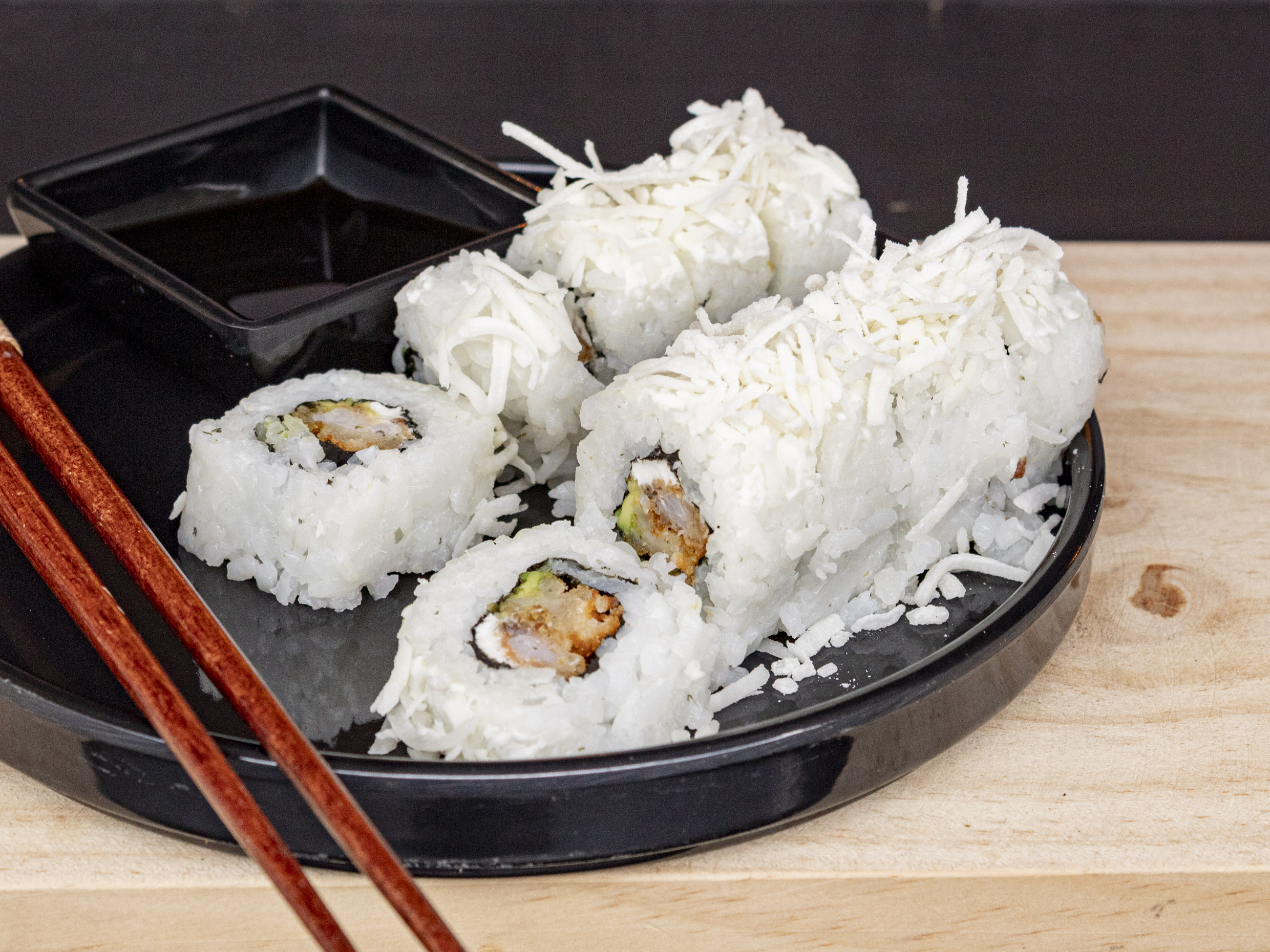Camarón empanizado, queso, aguacate y coco rallado por fuera.