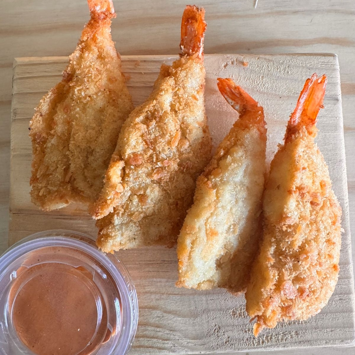 Camarón empanizado y aguacate por fuera.