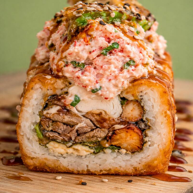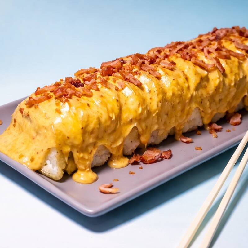 Rollo GIGANTE de surimi, res, pollo y camarón por dentro. Topping de Tampico y aguacate. Gratinado de queso Gouda chipotle con tocino crujiente