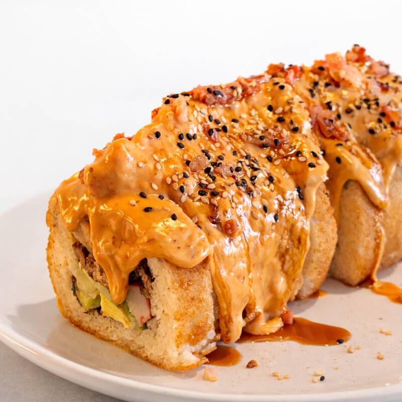 Rollo GIGANTE, de surimi y camarón por dentro, camarones tempura ( ROCCA ) bañados en salsa especial de sriracha, con Tampico y mechas de cangrejo. Salsa de anguila y ajonjolí